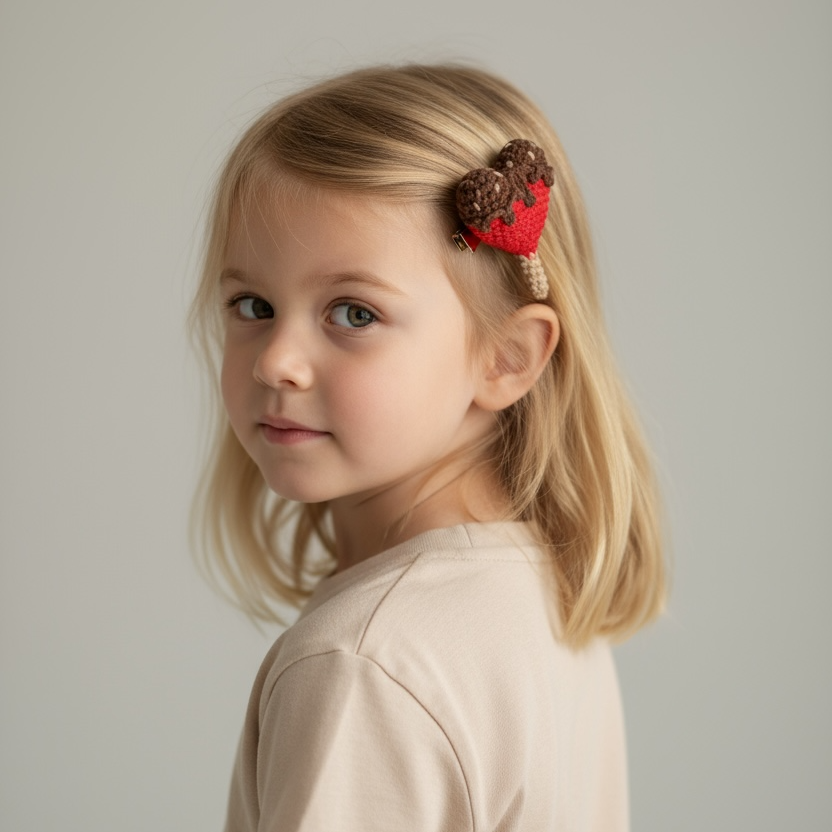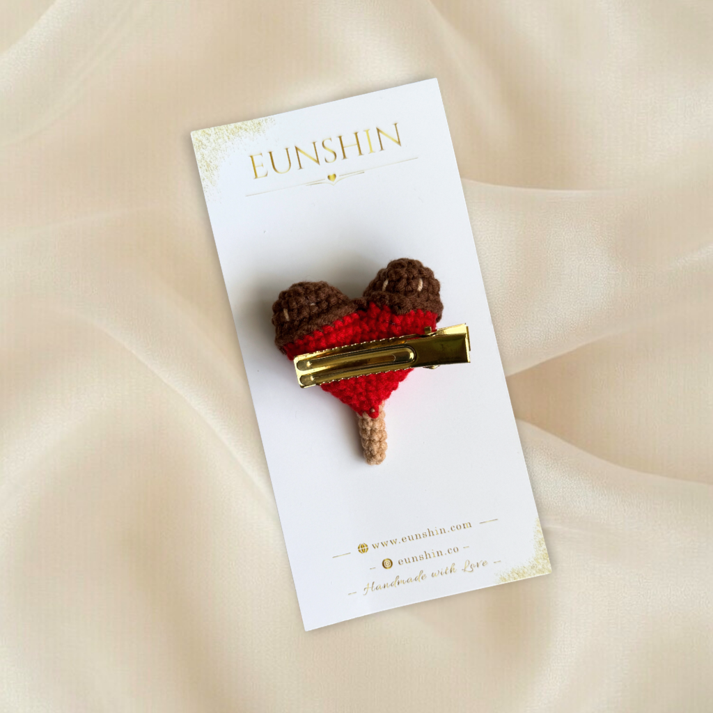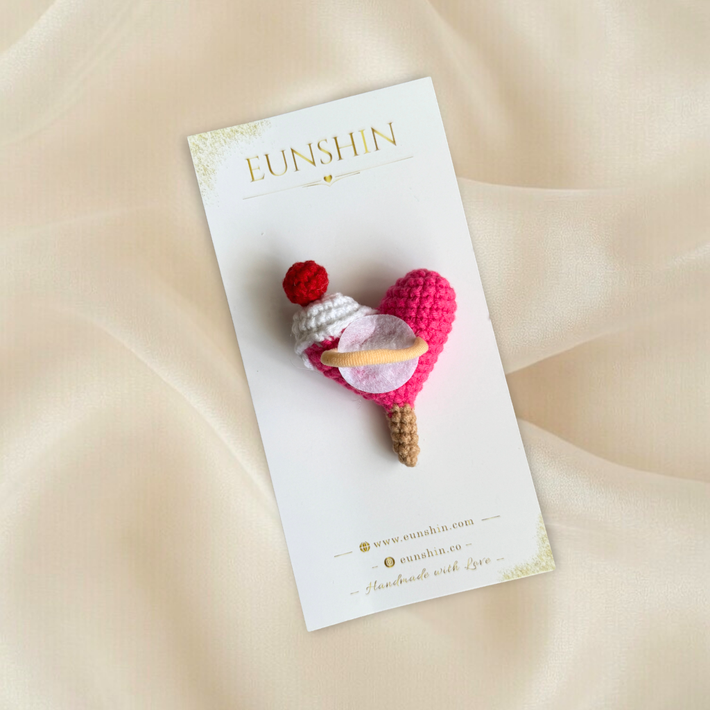 Sevimli kalp dondurma tasarımıyla hazırlanan amigurumi klips toka, çocukların stiline eğlenceli ve neşeli bir dokunuş katar. El işçiliği ile örülen kalp formu ve dondurma detayları tokaya özgün ve dikkat çekici bir görünüm kazandırır.