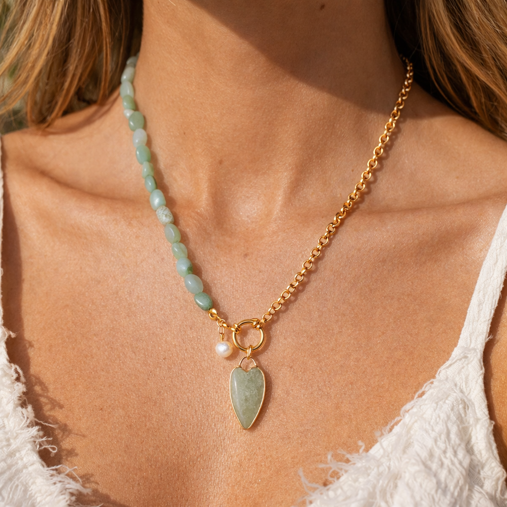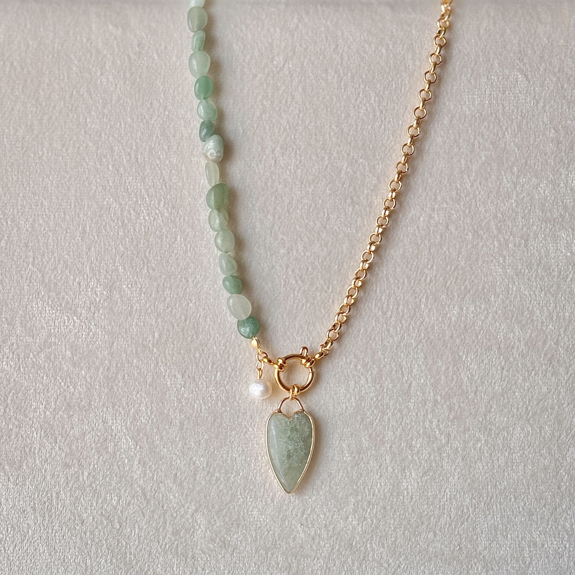 Doğal aventurin taş ve zincirin birleşimiyle tasarlanmış bu kolye, sade ama karakterli bir görünüm sunar. Taşın kendine özgü damar yapısı sayesinde her parça farklıdır ve doğal bir etki yaratır.