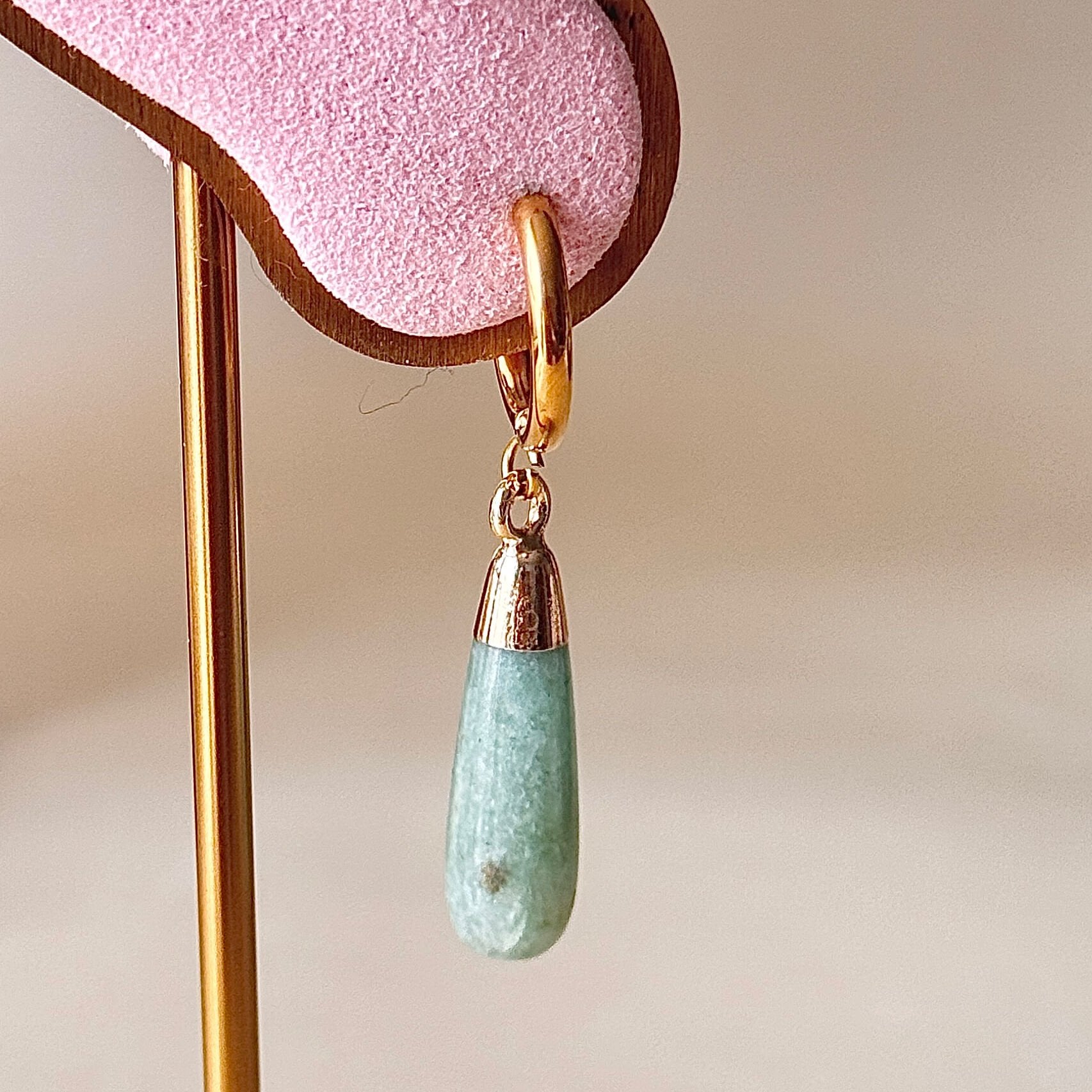 Damla formda kullanılan aventurin taş, yumuşak ve doğal tonlarıyla dengeli bir görünüm sunar. Doğal taş yapısı sayesinde her parça kendine özgü doku ve renk geçişlerine sahiptir.