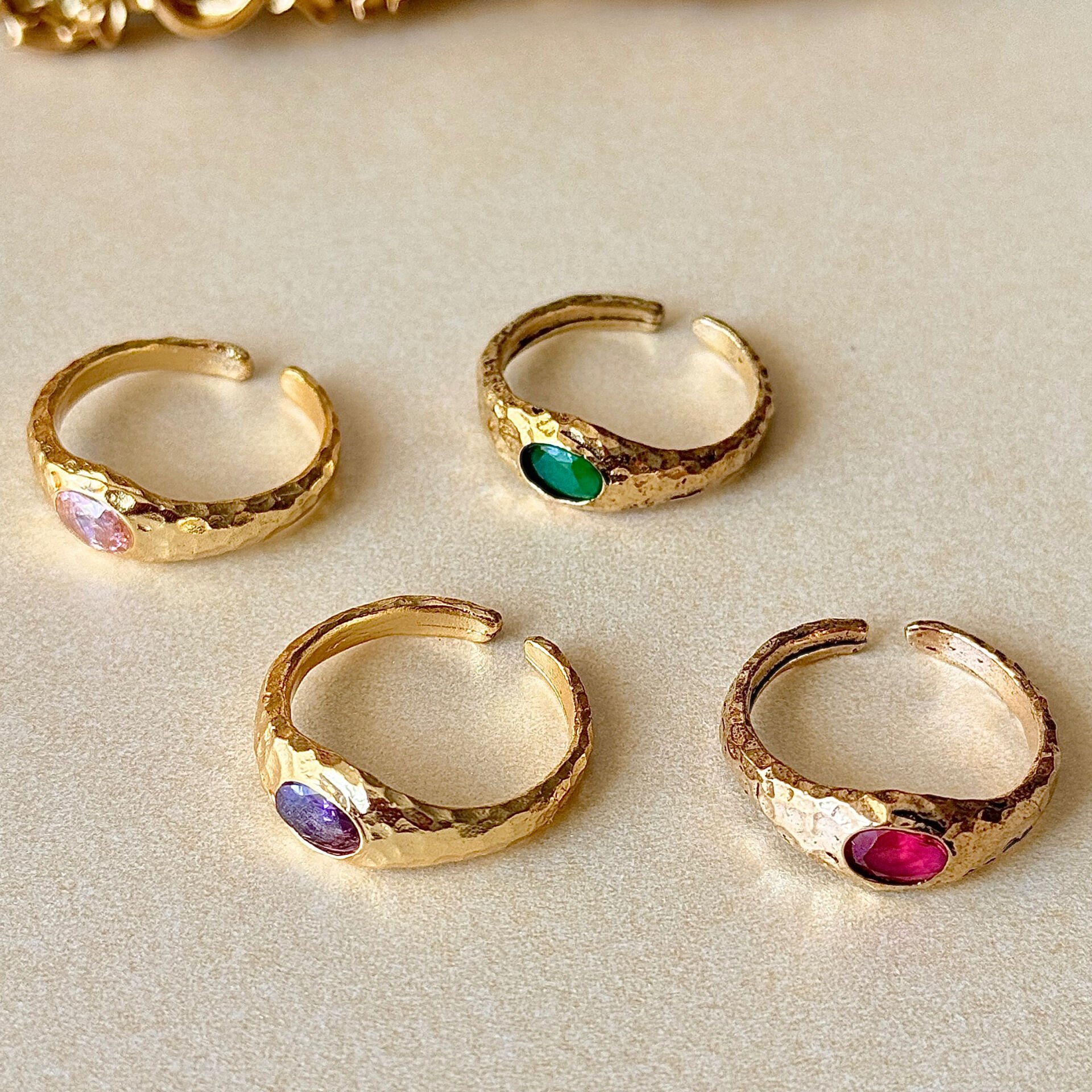 Minimal formuna rağmen dokulu yüzeyi ve taş detayı ile dikkat çeken bir parçadır. Tek başına kullanılabileceği gibi kombin yüzüklerle de uyum sağlar.