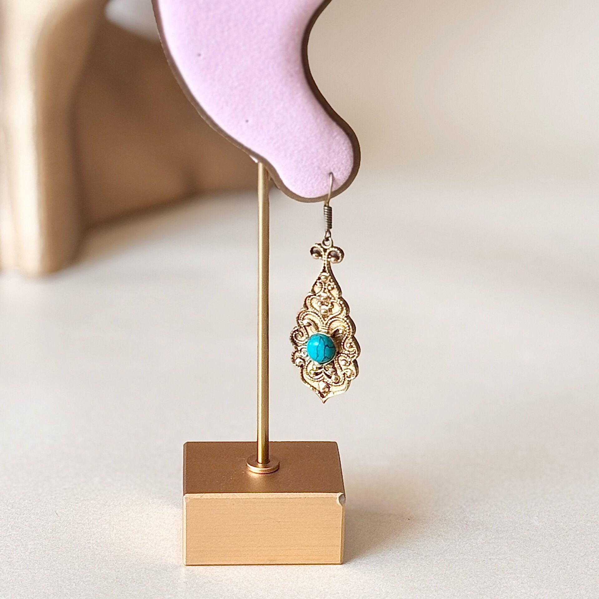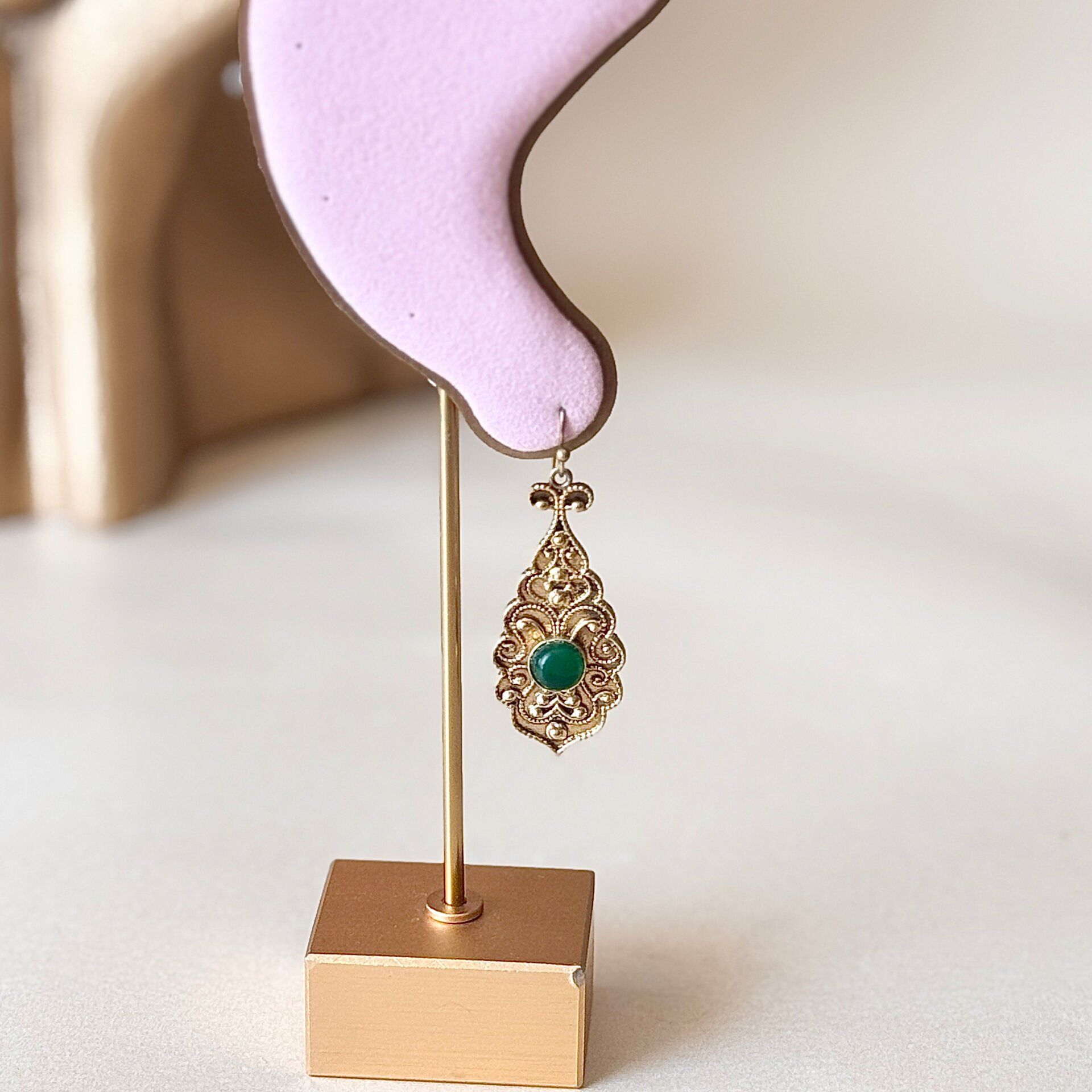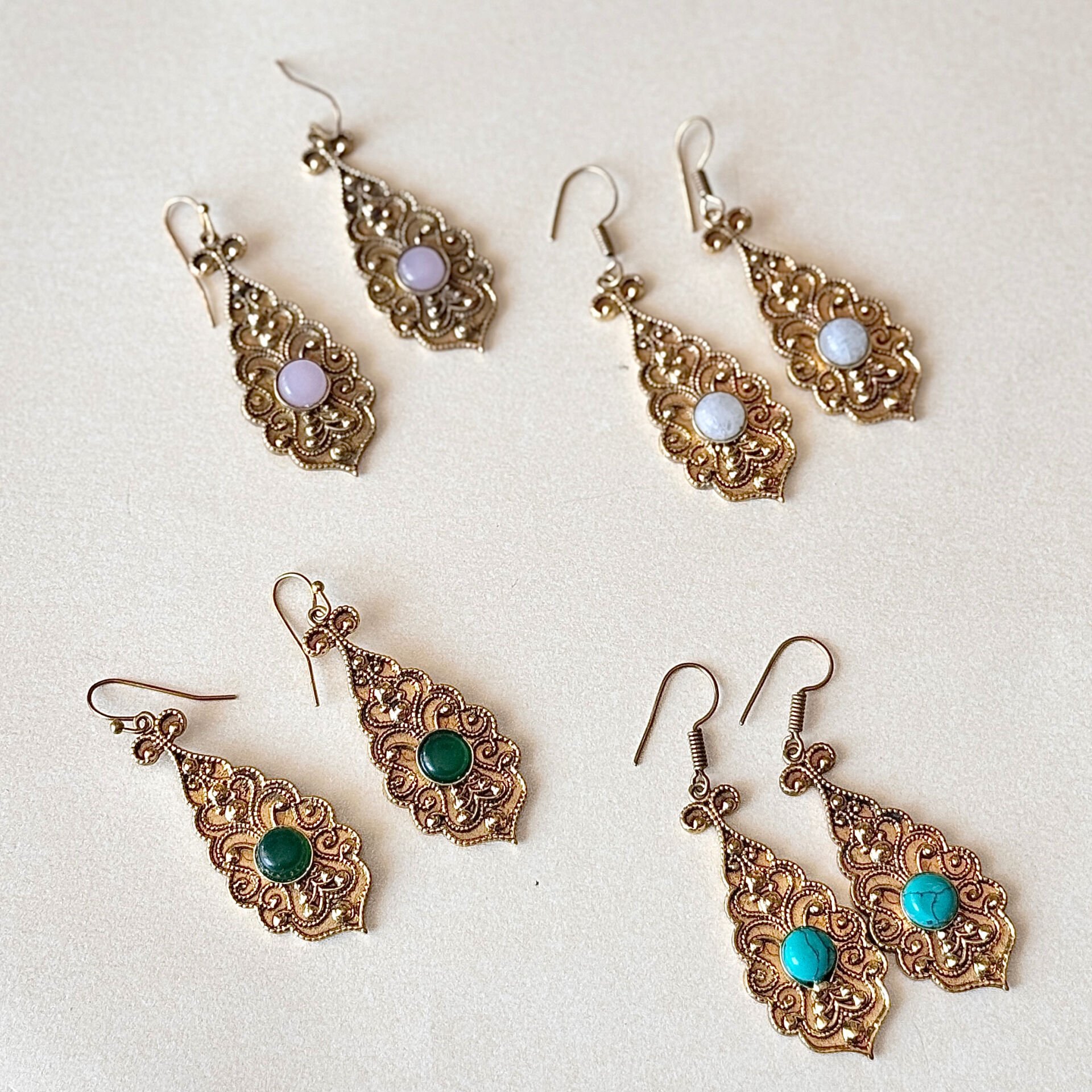 Bakır küpe modeli, işlemeli yüzeyi ve dikkat çekici taş detaylarıyla otantik stilin öne çıkan parçalarından biridir. Damla form tasarımı yüz hattını zarif şekilde tamamlar ve sade kombinleri bile daha güçlü gösterir. Yeşil, turkuaz, beyaz ve açık pembe tonlarındaki taş seçenekleri farklı tarzlara uyum sağlar. Vintage ve bohem stil sevenler için ideal olan bu model, günlük kullanımda şıklık katarken özel günlerde de dikkat çekici bir aksesuar olarak öne çıkar. Doğal bakır materyali zamanla kendine özgü bir patina oluşturabilir, bu durum ürüne karakter katar ve her parçayı daha özel hale getirir