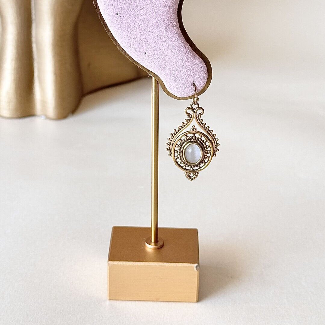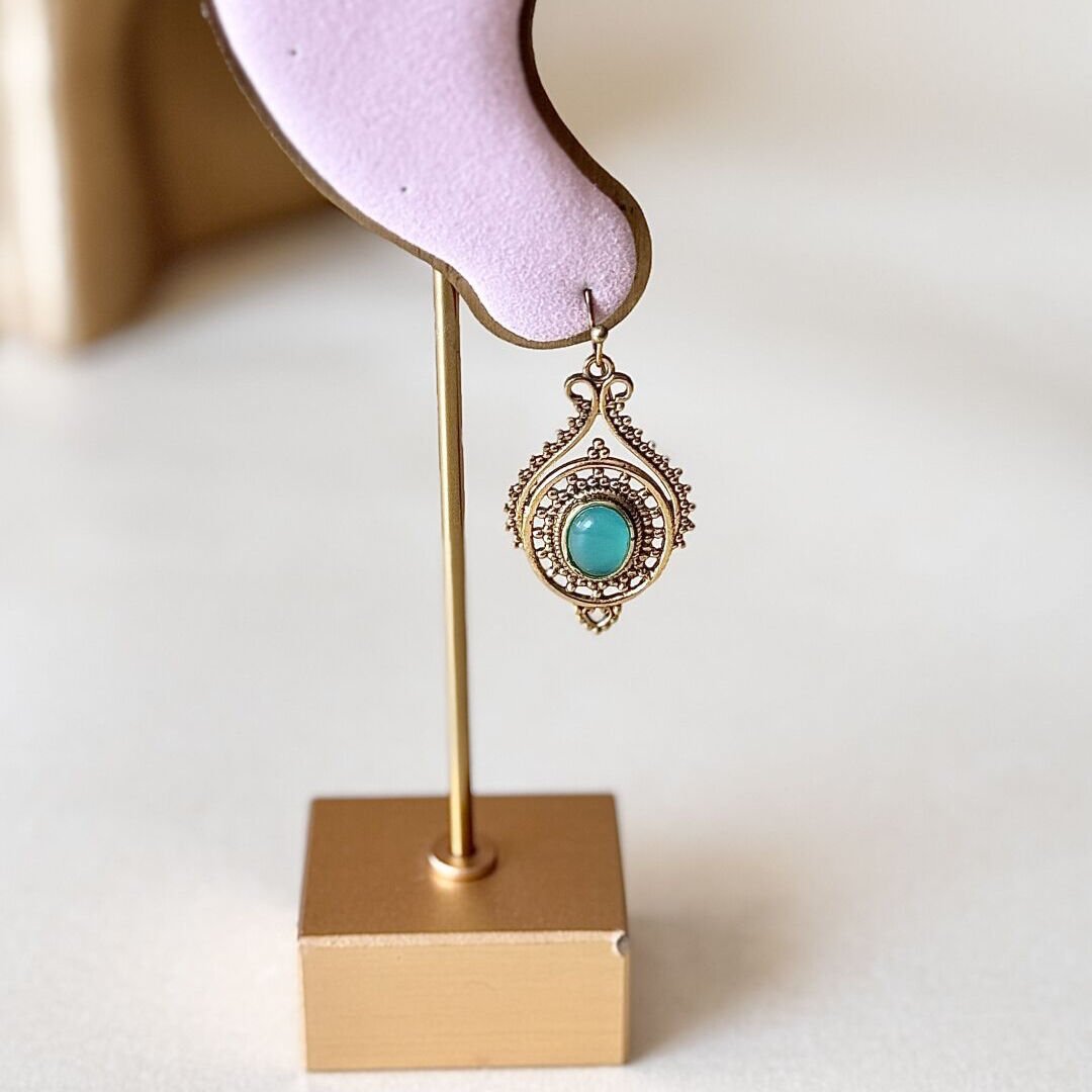 Bakır küpe modeli, ince işçiliği ve oval damla form tasarımıyla vintage stilin güçlü bir temsilcisidir. Detaylı motif yapısı ve taşlı merkez tasarımı sayesinde sade kombinlere bile dikkat çekici bir dokunuş katar. Turuncu, beyaz, mor ve yeşil tonlarındaki taş seçenekleri farklı tarzlara uyum sağlar ve kombinleri tamamlayan güçlü bir aksesuar haline gelir.