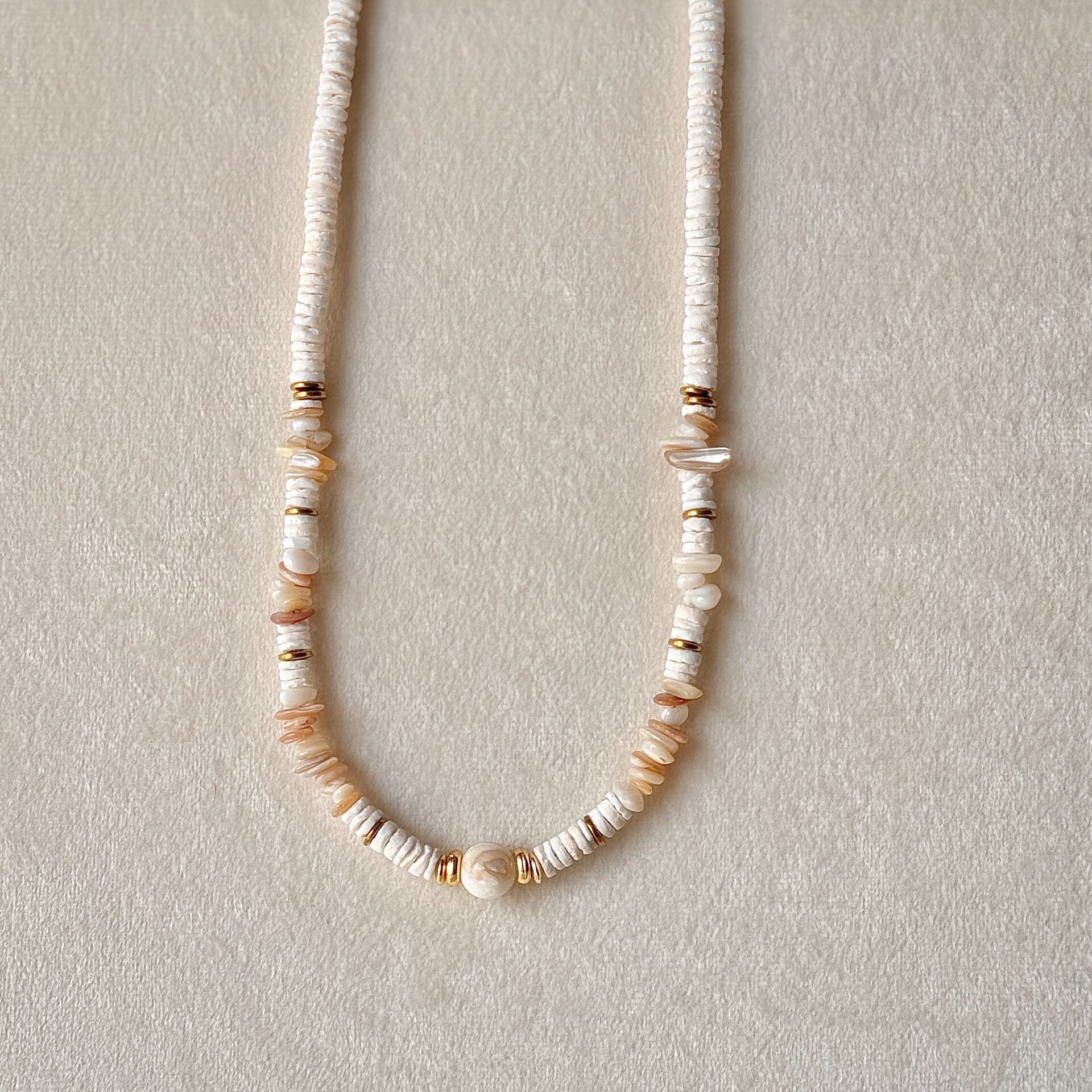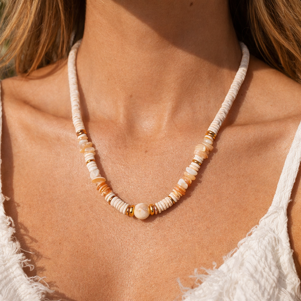 Beyaz mercan, akik ve sedef taşlarının bir araya geldiği bu kolye, doğal ve yalın bir görünüm sunar. Farklı formdaki taşların uyumu sayesinde her parça kendine özgü bir karakter taşır.