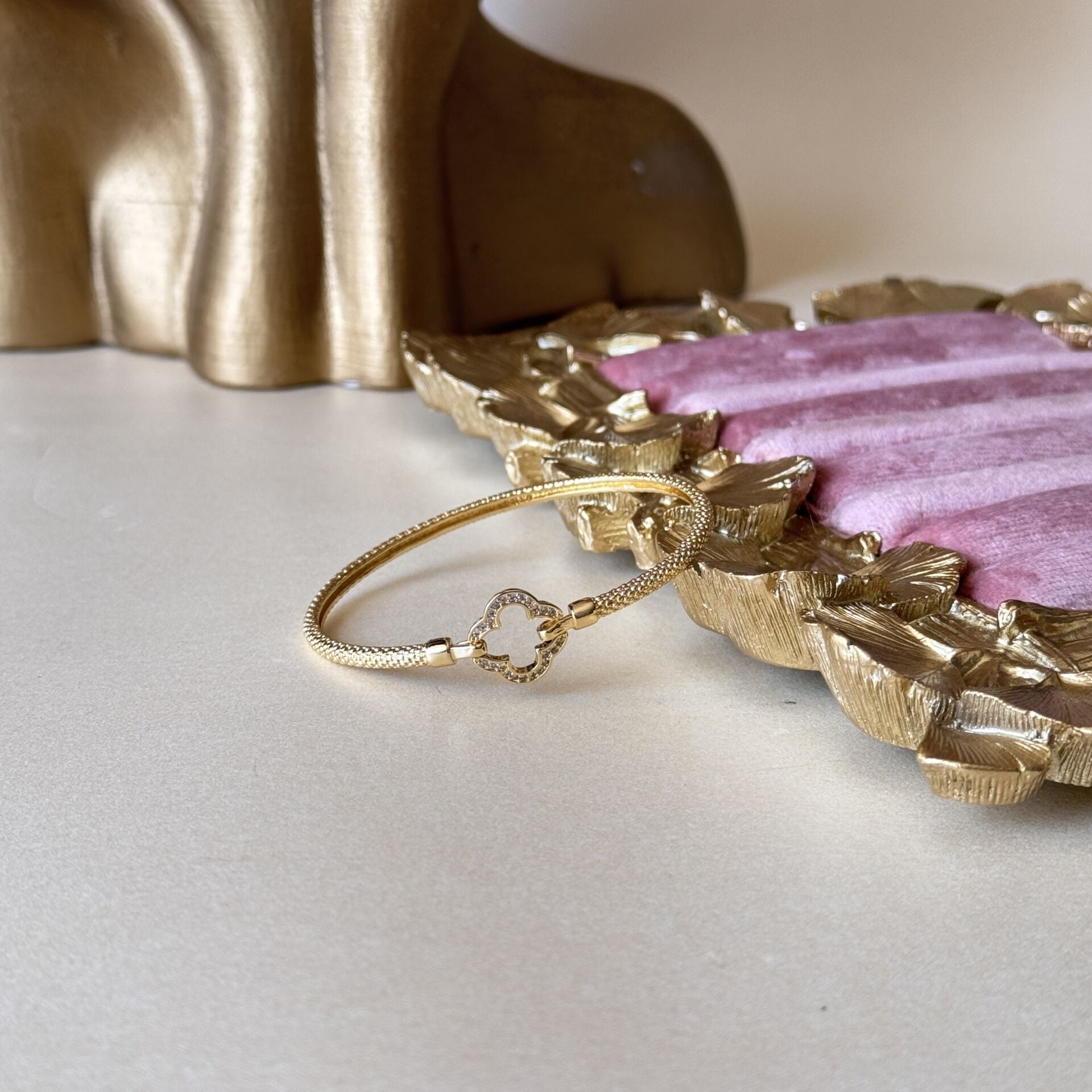 Zirkon taşlı yonca form detayı, ışığı yumuşak şekilde yansıtarak ürüne sade ama dikkat çekici bir karakter kazandırır. Abartıdan uzak, ama boş da olmayan bir tasarım.