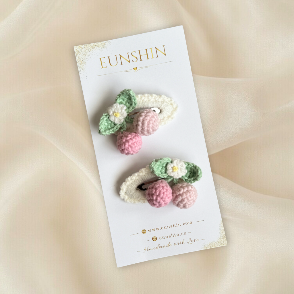 Sevimli kiraz formu ve pastel tonların uyumuyla hazırlanan bu el yapımı örgü toka, saçlara tatlı ve neşeli bir dokunuş kazandırır. Romantik ve doğal görünümü sayesinde günlük kullanımda zarif bir tamamlayıcı olurken, özel gün kombinlerine de şirin bir vurgu katar.
