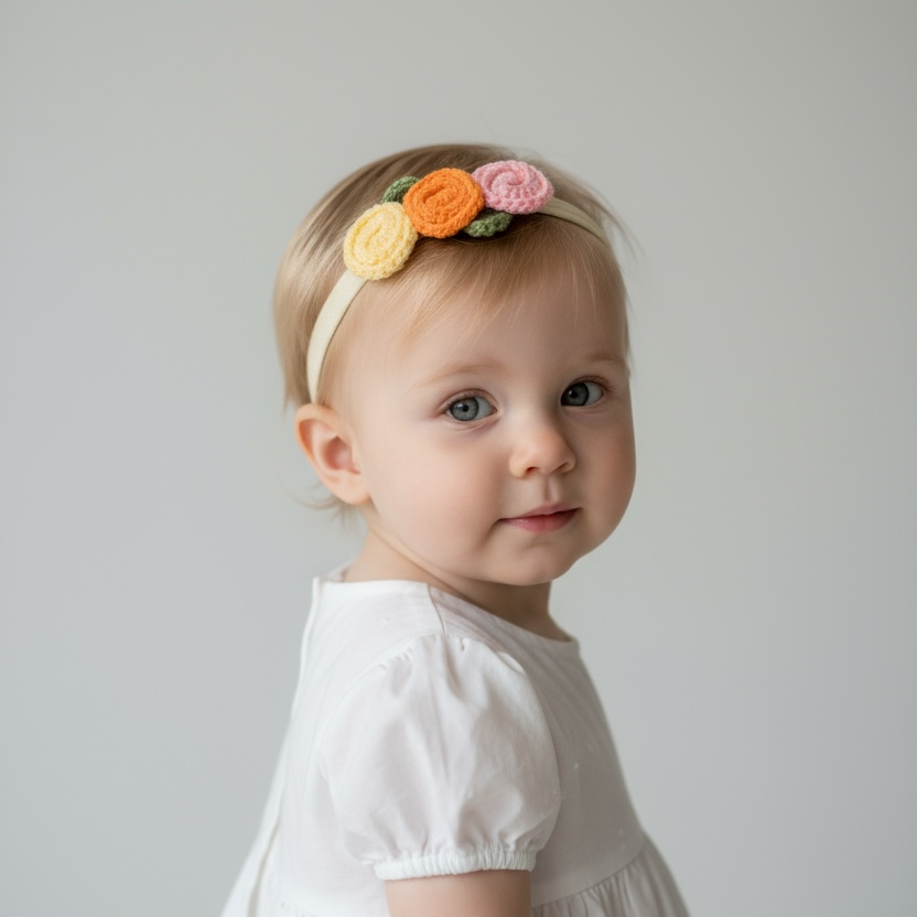 Pastel tonlarda mini gül detaylarıyla tasarlanan el yapımı bebek kafa bandı, hassas bebek cildi için yumuşak ve esnek yapıdadır. Günlük kullanım, özel günler ve fotoğraf çekimleri için zarif bir tamamlayıcıdır.