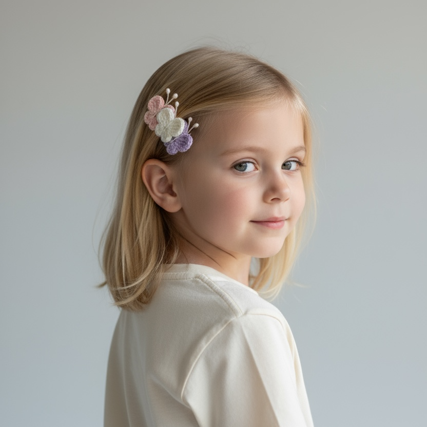 Pastel renk tonlarıyla tasarlanan el yapımı örgü kelebek klips toka, zarif ve sevimli görünümüyle çocuklar ve yetişkinler için ideal bir saç aksesuarıdır.