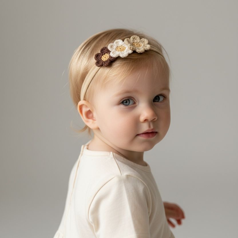 Doğal krem ve kahve tonlarında el yapımı çiçek detaylarıyla tasarlanan bebek kafa bandı, hassas bebek cildi için yumuşak ve esnek yapıya sahiptir. Günlük kullanım, özel günler ve fotoğraf çekimleri için zarif bir tamamlayıcıdır.