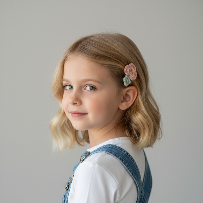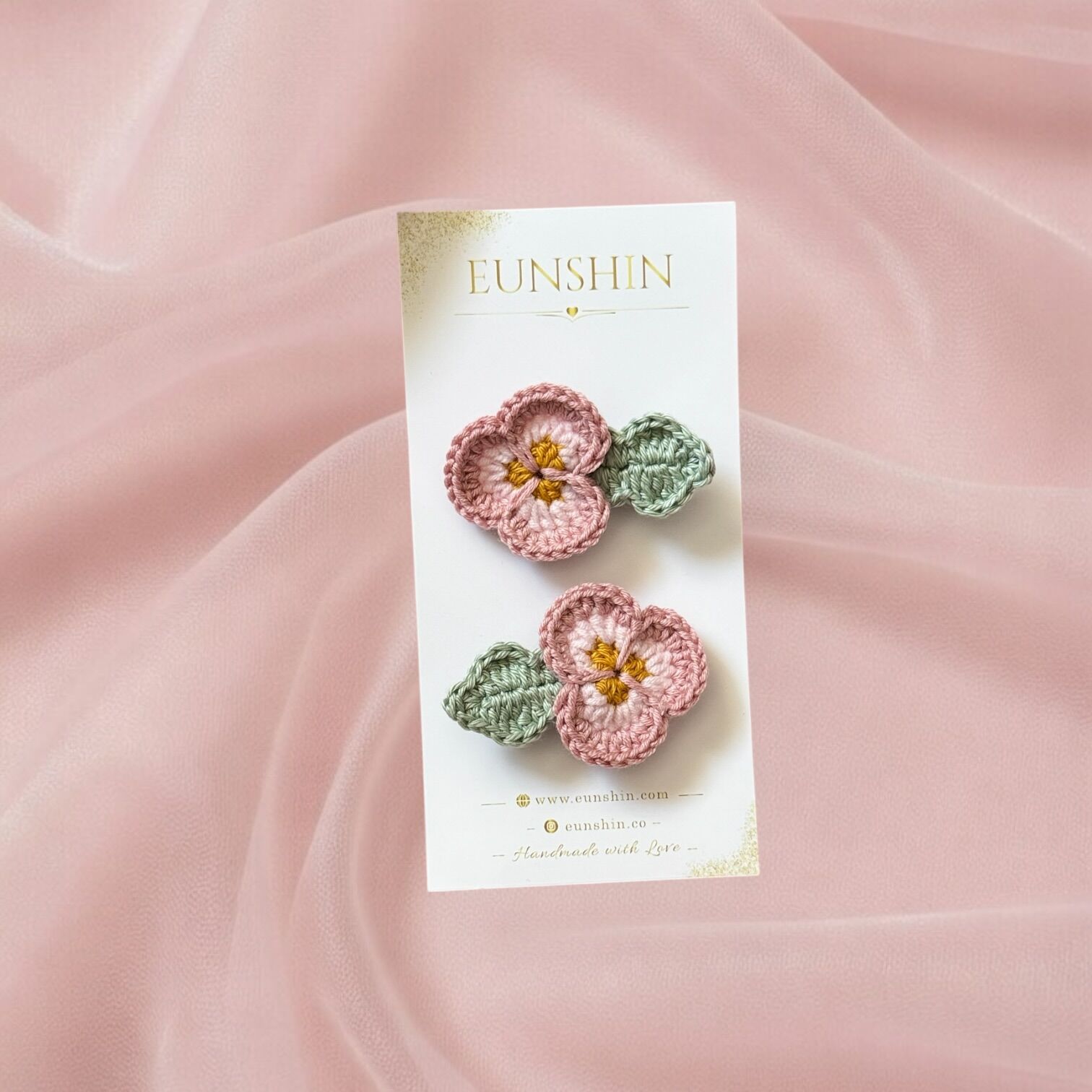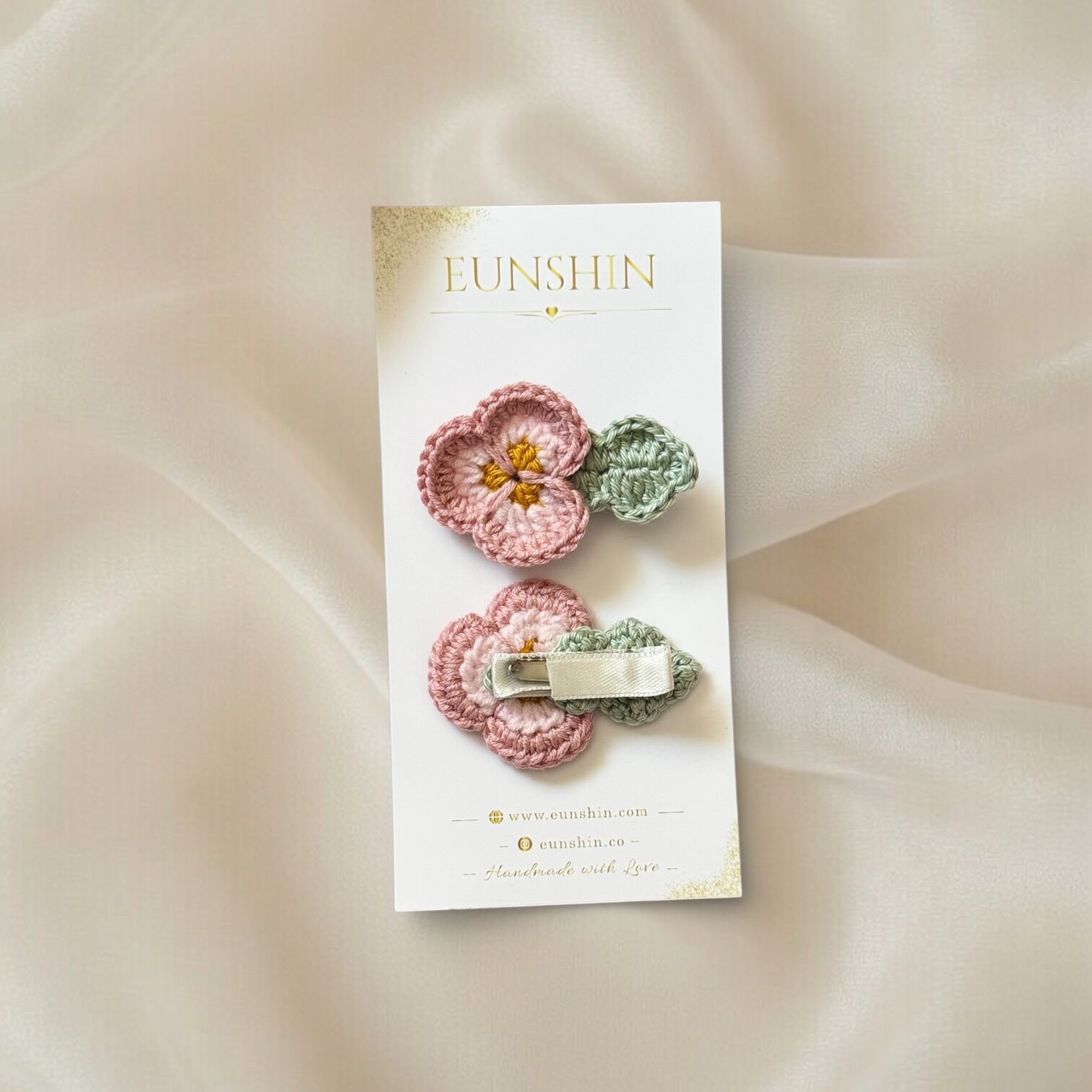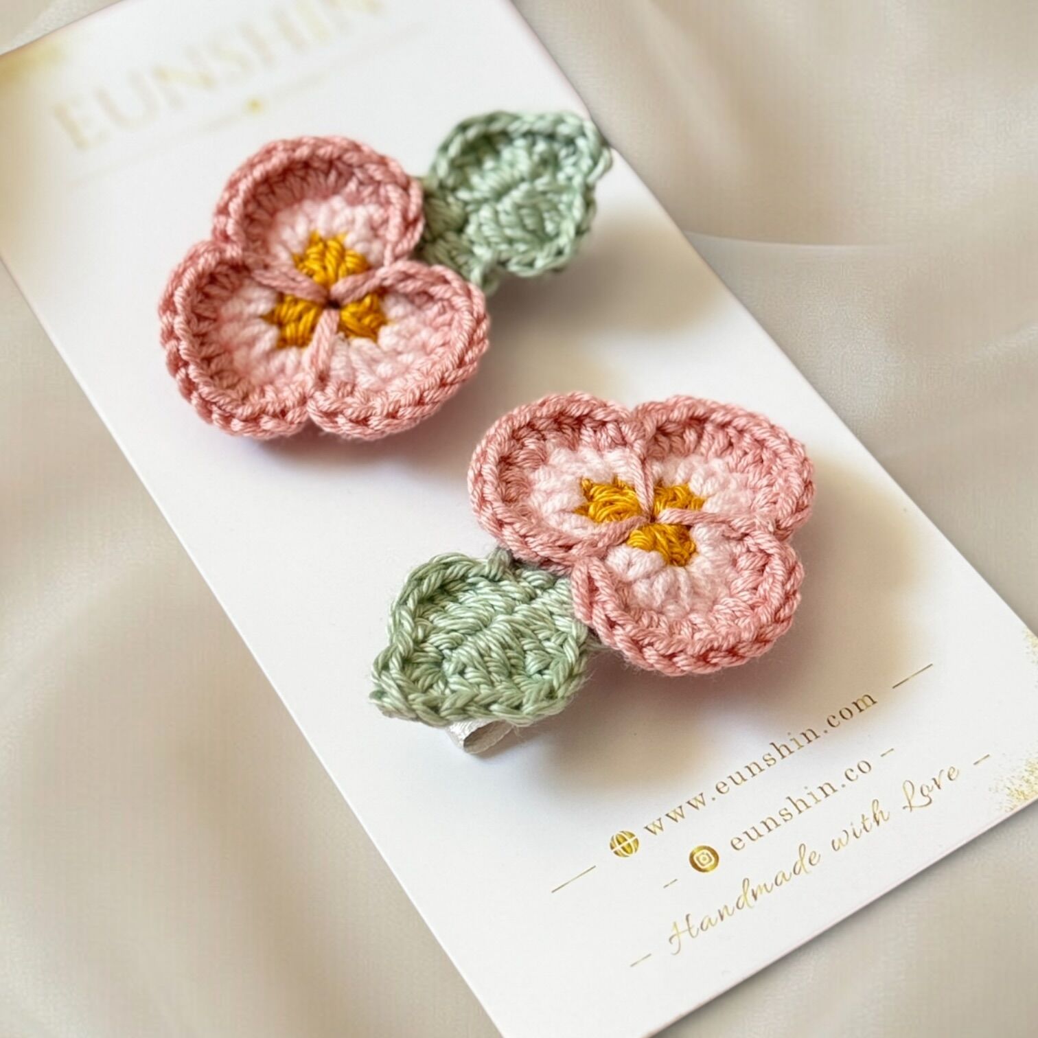 Pastel tonları ve zarif menekşe çiçek formuyla tasarlanan bu el yapımı örgü klips toka, çocuklar ve yetişkinler için günlük kullanıma uygun şık bir saç aksesuarıdır.