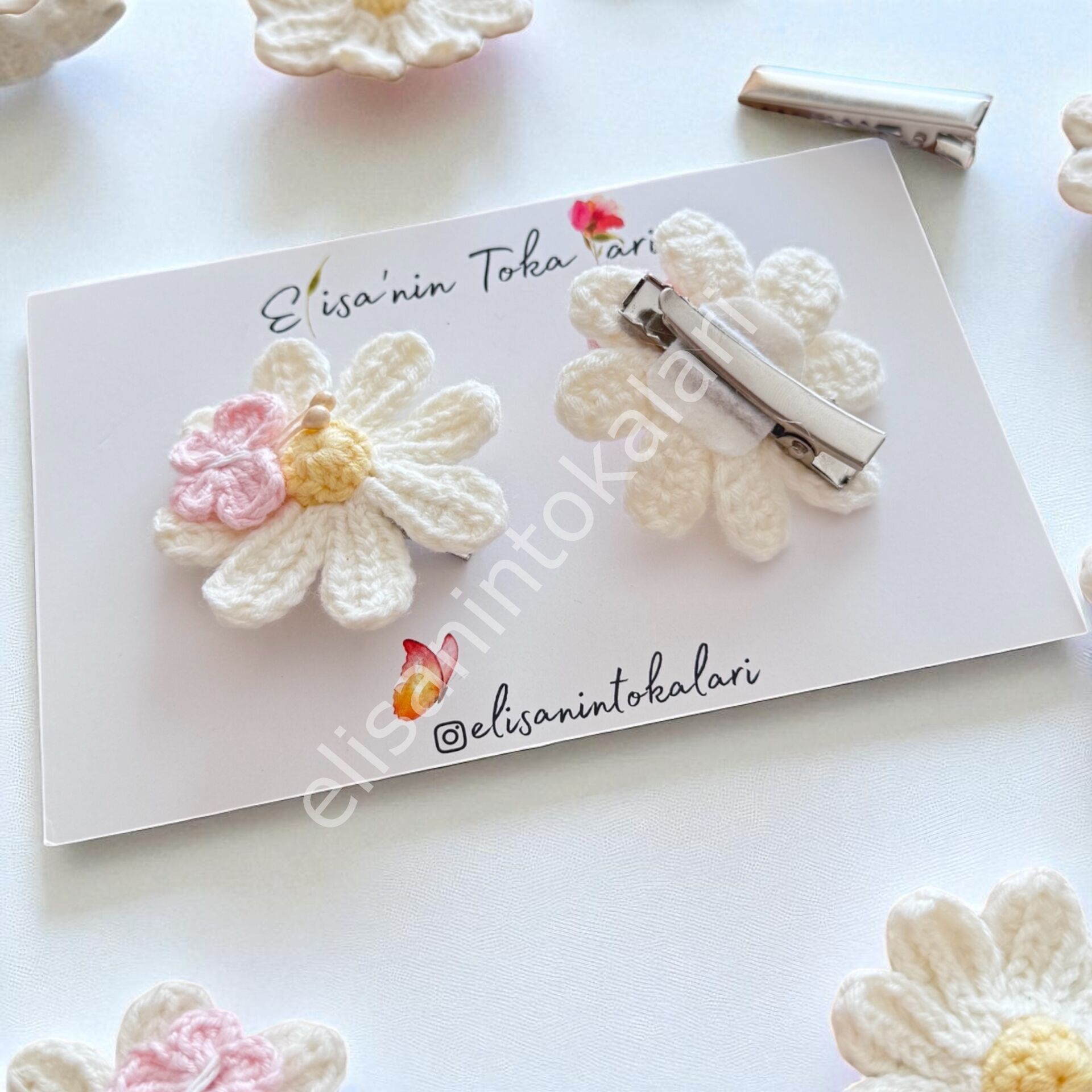 Kelebek ve papatya çiçeklerinin zarif uyumuyla tasarlanan bu el yapımı klips toka, romantik ve masalsı bir görünüm sunar. Yumuşak pastel tonları sayesinde hem bebekler hem çocuklar hem de zarif stil seven yetişkinler için ideal bir aksesuardır.