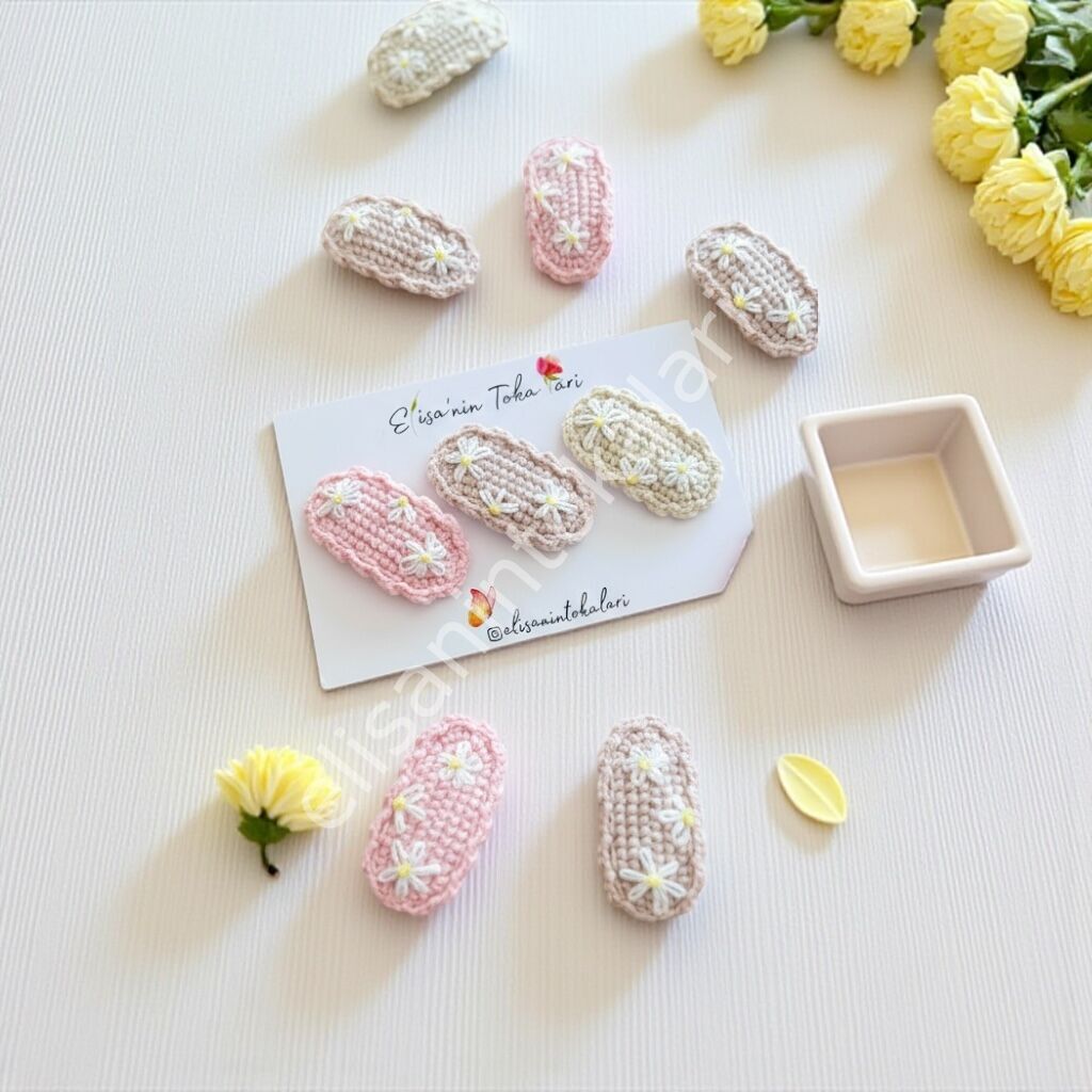 Papatya Nakışlı Örgü Çıtçıt Toka – 3 Renk Seçenekli El Yapımı Saç Aksesuarı