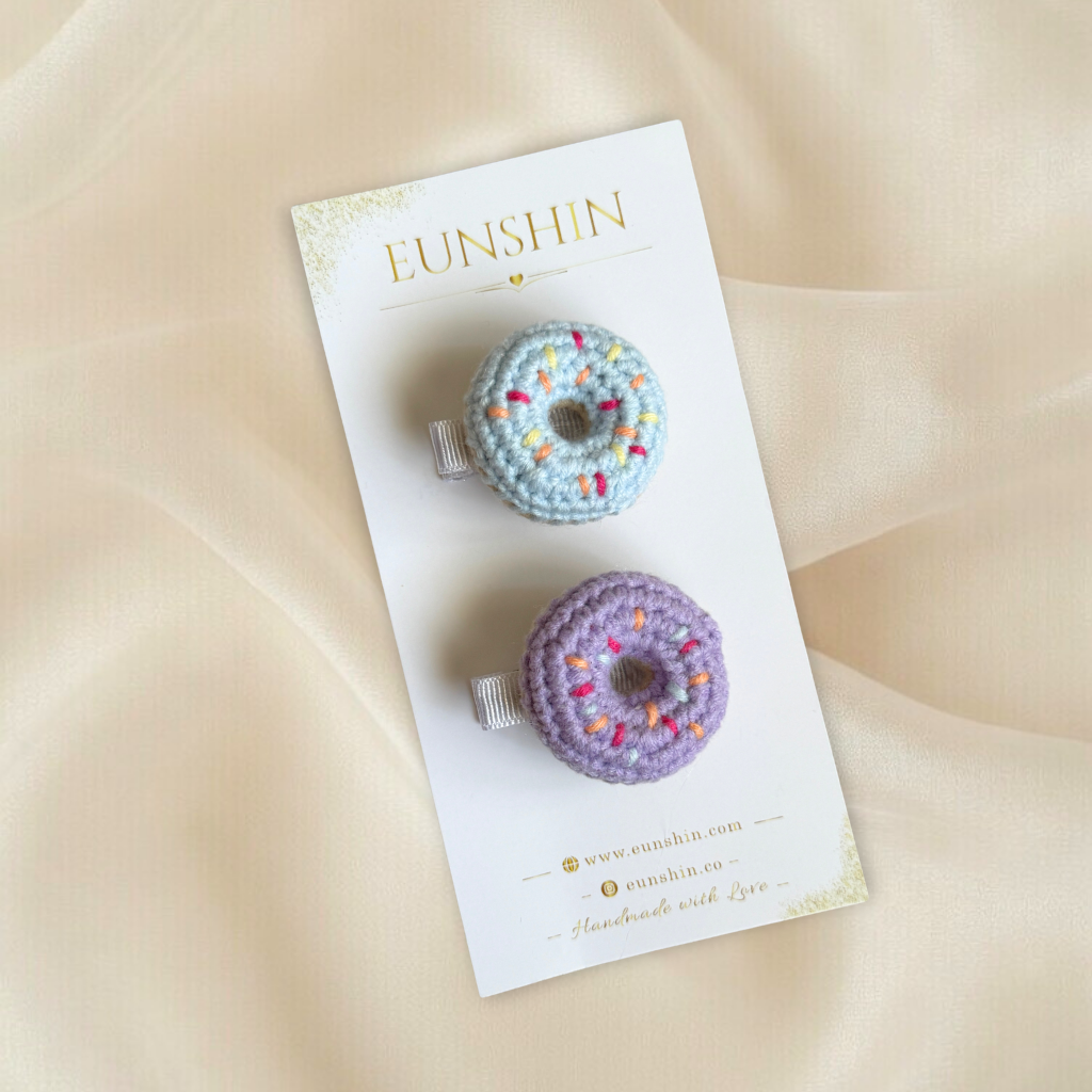El yapımı donut amigurimi 4,5 cm klips toka. Sevimli ve hafif tasarımıyla bebek & çocuk saç aksesuarı için ideal.