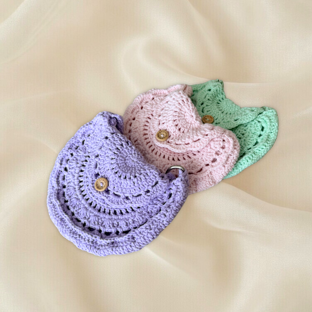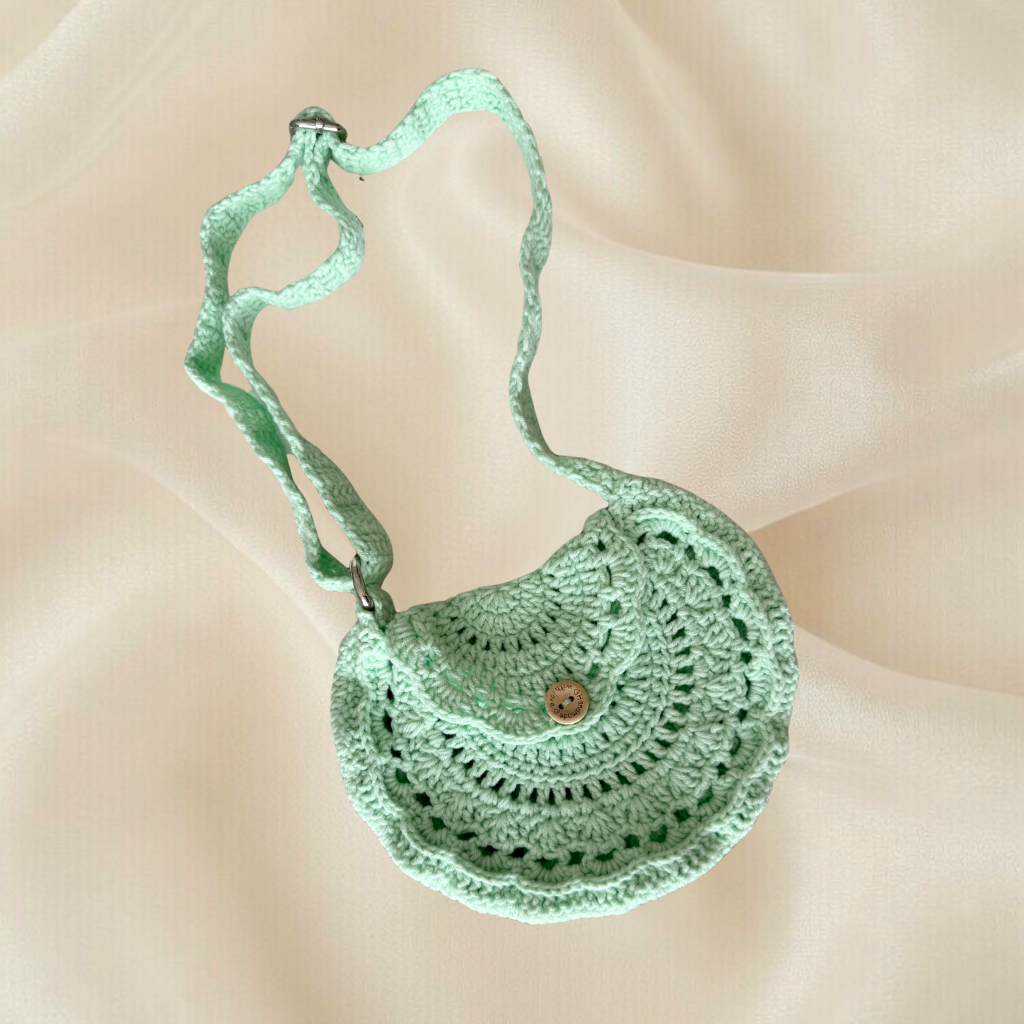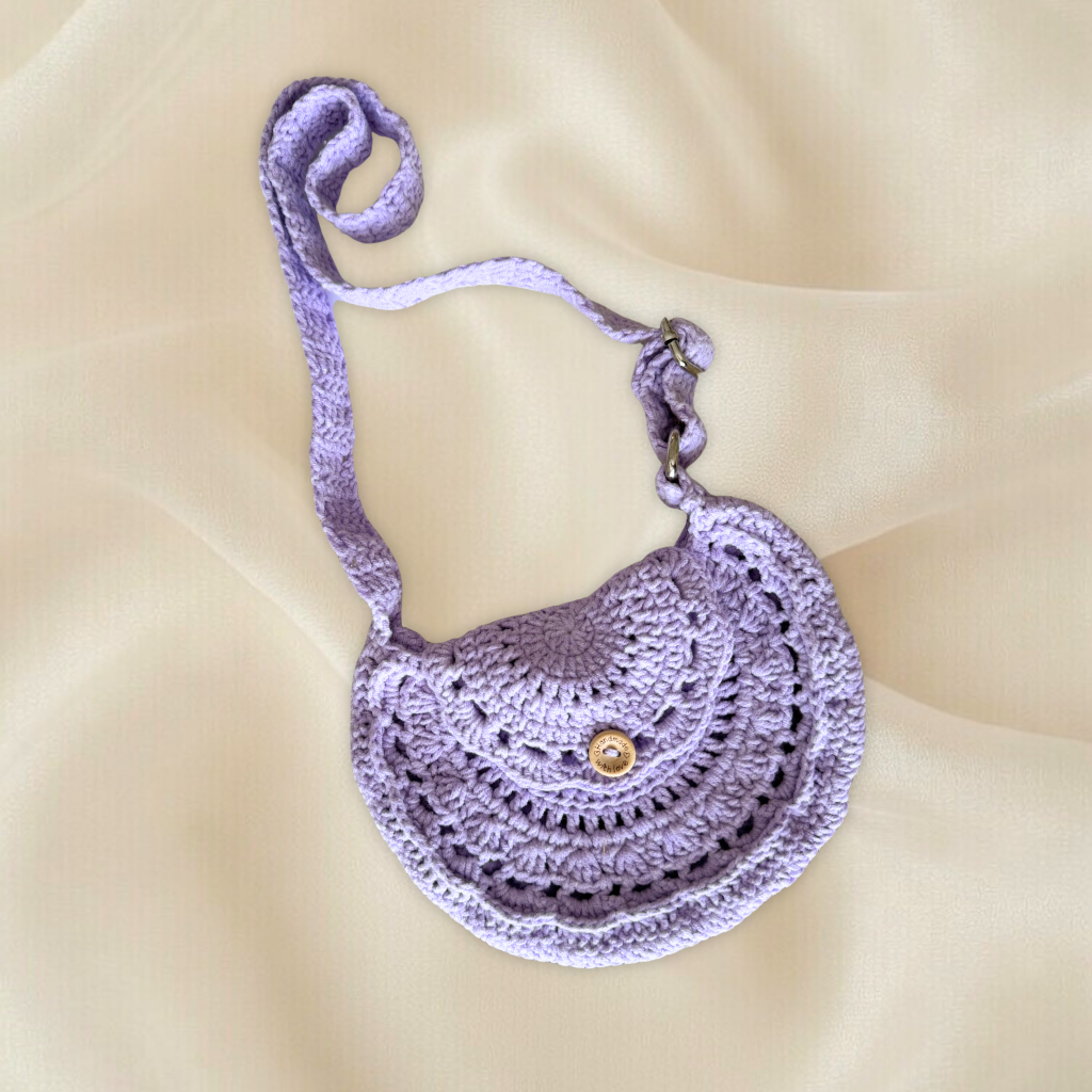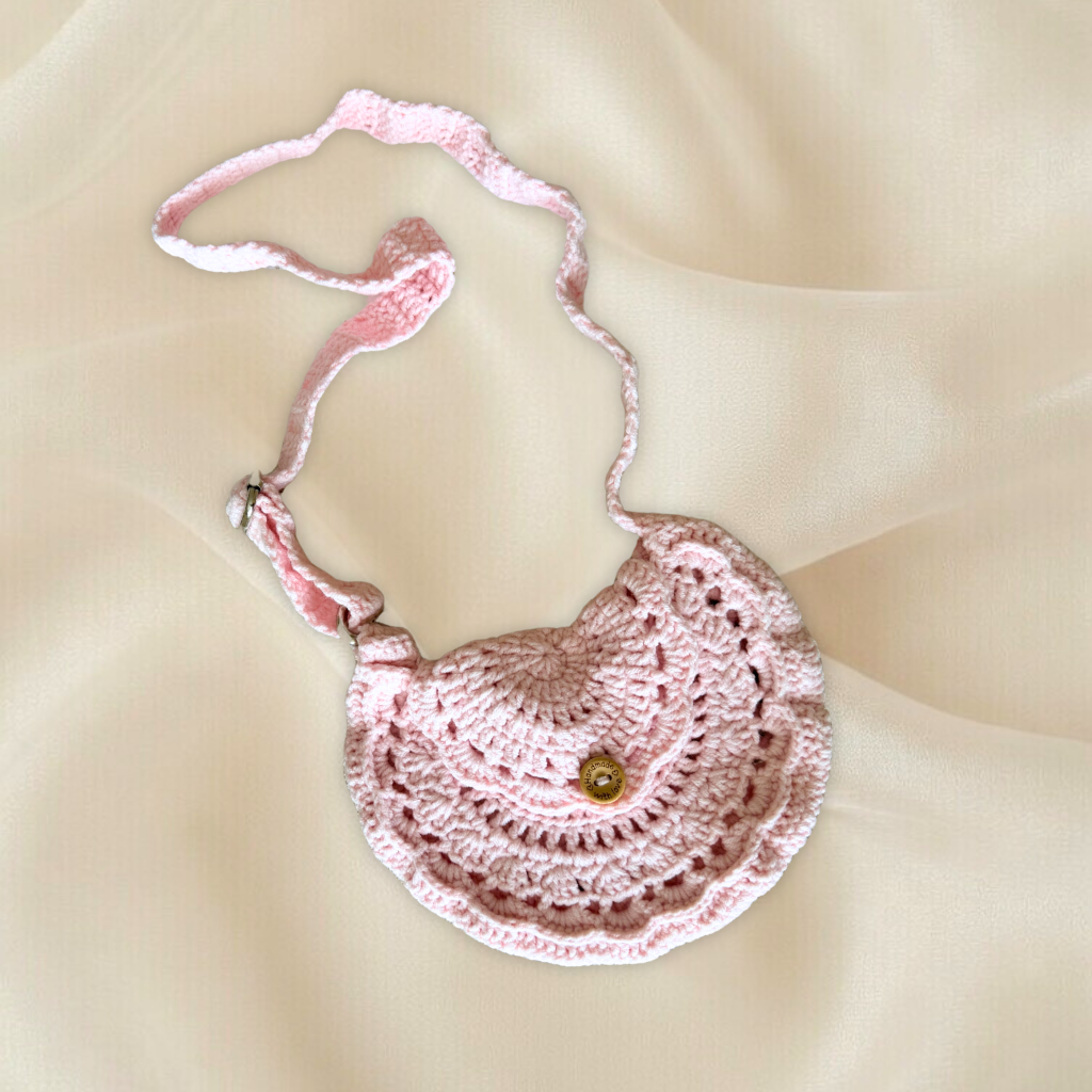 Tamamen el emeği ile hazırlanan bu örgü çocuk çantası, sevimli yarım ay formu ve pastel renk seçenekleri ile çocuklar için şık bir aksesuar sunar.