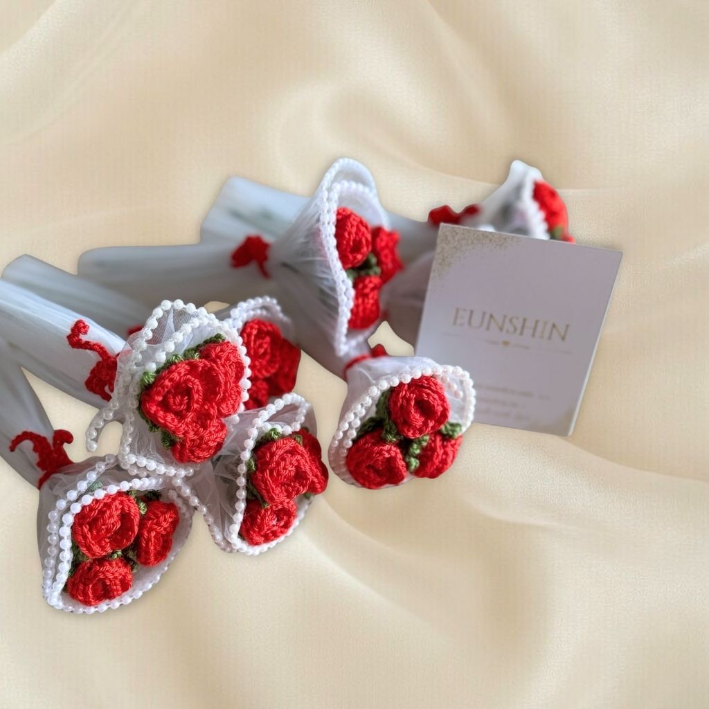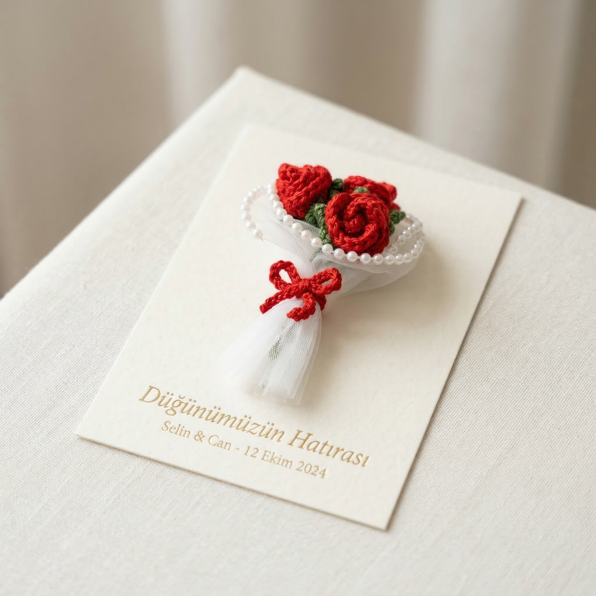 El emeği örgü gül buketi nikah magneti, düğün ve nikah organizasyonlarınız için hazırlanmış zarif ve unutulmaz bir hatıradır.