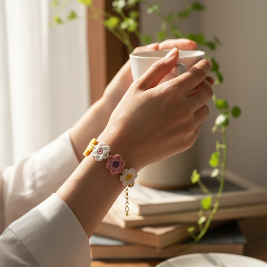 El emeği ile hazırlanan örgü papatya bileklik, renkli çiçek detaylarıyla zarif ve sevimli bir görünüm sunar. İnce işçilikle hazırlanan papatya motifleri bilekliğe doğal ve estetik bir dokunuş kazandırır.