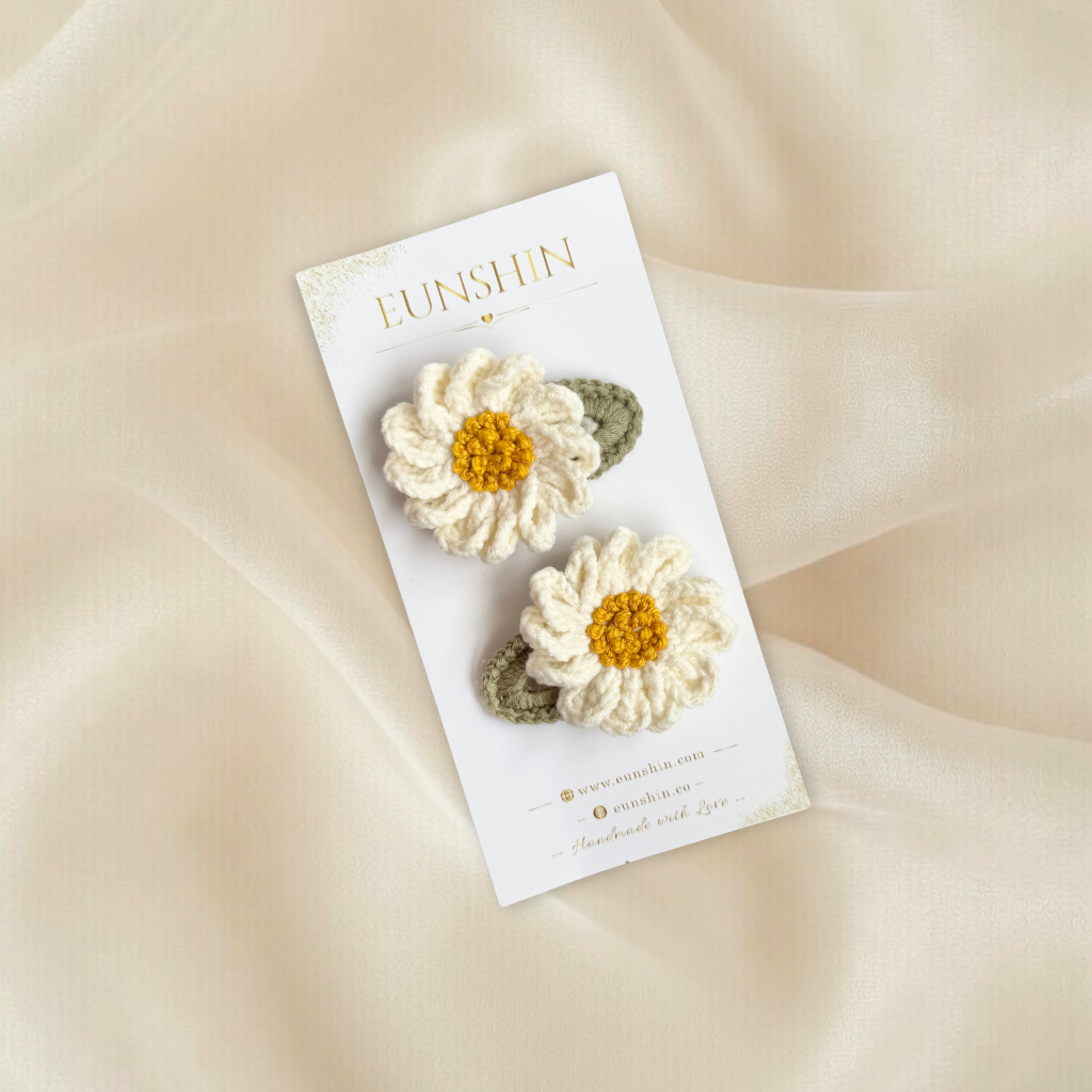 El örgüsü tomurcuklu papatya detaylı 5 cm çıtçıt toka, bebek ve çocuklar için zarif ve güvenli bir saç aksesuarıdır. Yumuşak iplik yapısı saçlara zarar vermez, kayma yapmayan toka mekanizması gün boyu rahat kullanım sağlar.