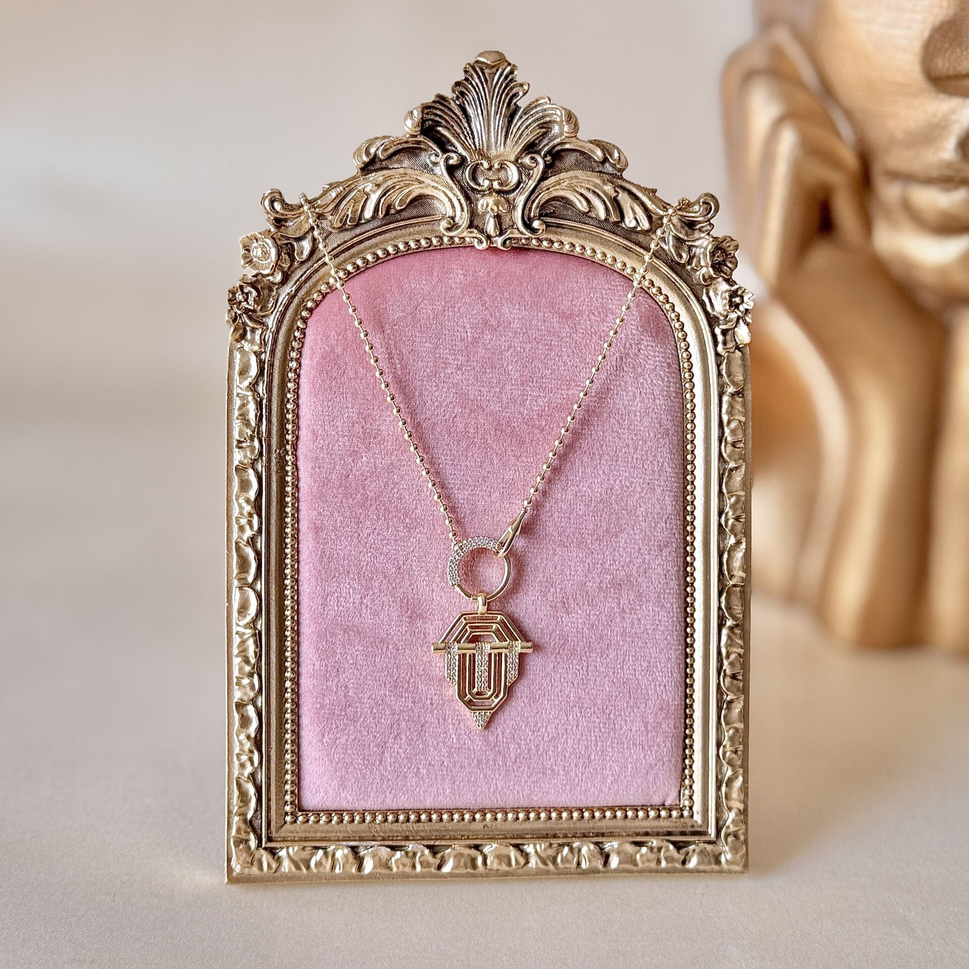 Geometrik formda tasarlanmış sarkaç kolye, merkezdeki taşlı halka ve altındaki detaylı uç tasarımıyla farklı bir stil sunar. Klasik kolyelerden ayrılan yapısı sayesinde tek başına dikkat çeker ve kombinlere karakter katar.