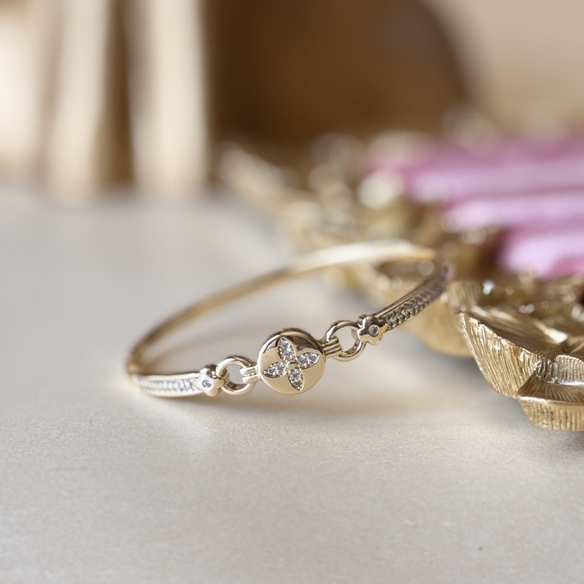 Çelil kelepçe bileklik, ortadaki yonca form detayı ve ince taş işçiliği ile zarif bir ışıltı sunar. İnce kelepçe yapısı bilekte hafif ve dengeli bir duruş sağlar.