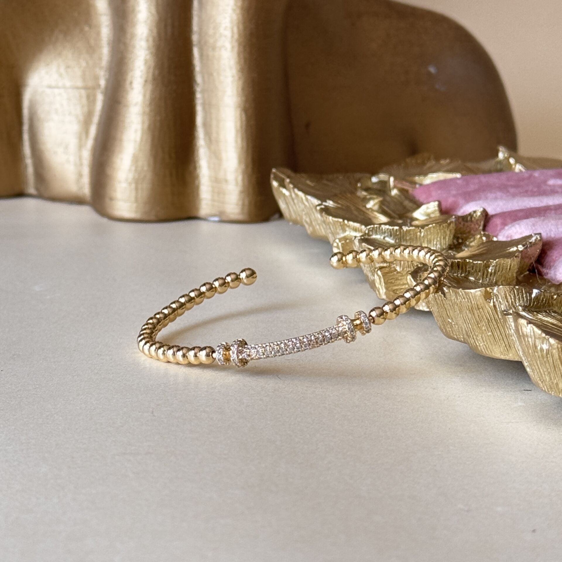 Çelik kelepçe bileklik, kenarlardaki metal boncuk formu ve ortadaki zirkon taşlı bar detayı ile dengeli bir ışıltı sunar. Boncuk dizilimli yapı bilekte hareketli ve dolgun bir görünüm oluştururken, ortadaki taşlı bölüm ürüne zarif bir odak noktası kazandırır.