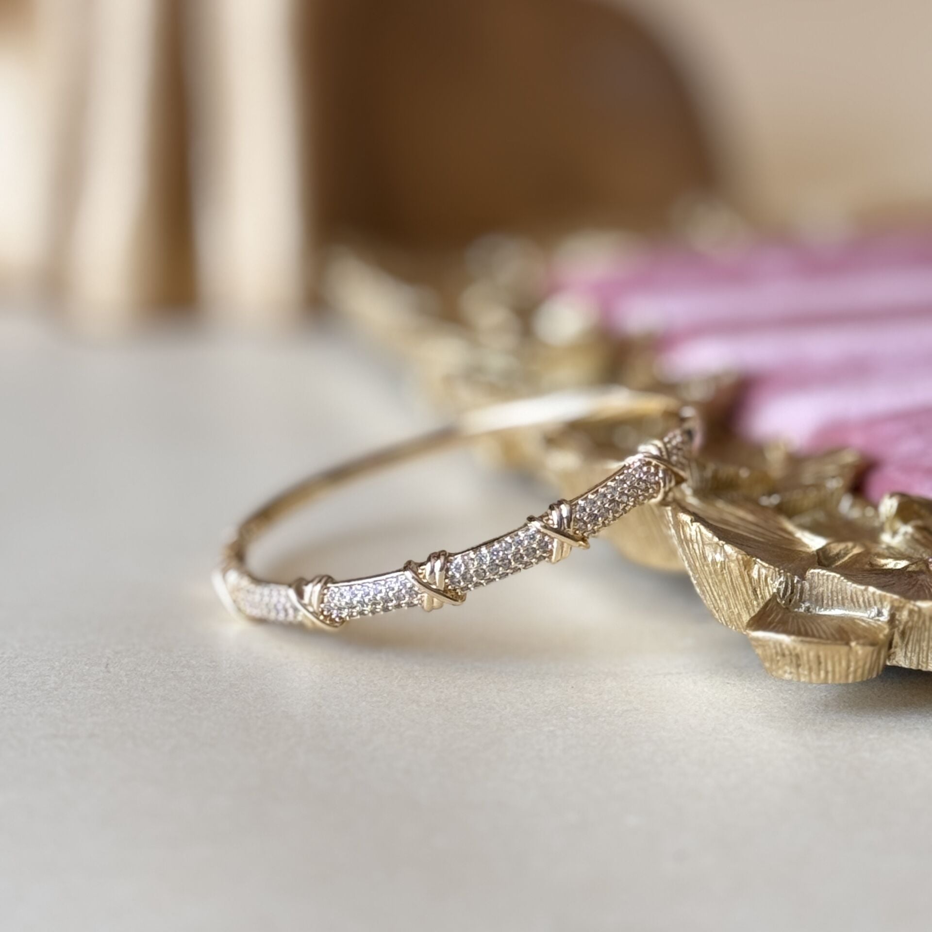 Gold kaplama kelepçe bileklik, üzerinde yer alan zirkon taşlı segment detayları ile ışığı dengeli şekilde yansıtan zarif bir tasarımdır. İnce kelepçe formu bilekte hafif ve şık bir duruş sağlar.