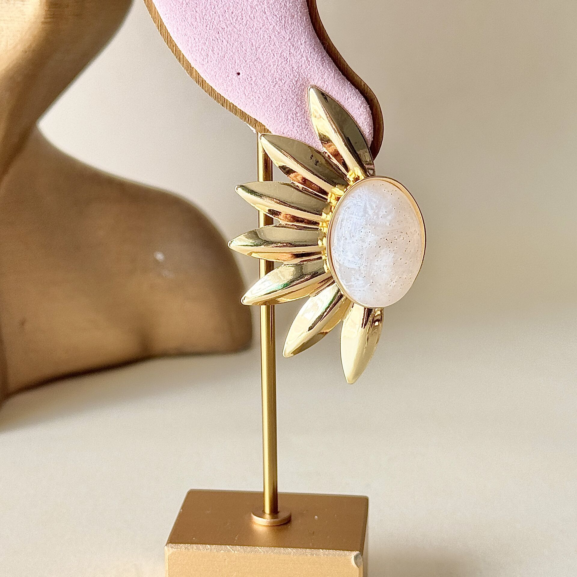 Güneş formundan ilham alan bu taşlı küpe, zarif ve dikkat çekici tasarımıyla stilinize ışık katar. Pirinç üzeri gold kaplama yapısı sayesinde parlak ve premium bir görünüm sunarken, ortasındaki açık ton taş detayı küpeye yumuşak ve sofistike bir dokunuş kazandırır. Minimal ama etkili tasarımı sayesinde hem günlük kombinlerde hem de özel davetlerde rahatlıkla kullanılabilir. Hafif yapısı ile konforlu kullanım sunar. Eunshin koleksiyonunun modern ve zarif parçalarından biridir.