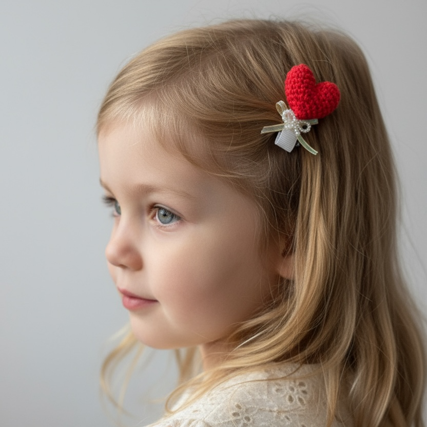 Sevgi ve zarafeti bir araya getiren amigurumi kalp klips toka, romantik ve sevimli tasarımıyla bebek ve çocuk saç aksesuarları arasında özel bir yere sahiptir. El yapımı örgü kalp formu sıcak ve duygusal bir görünüm sunarken inci detayları tokaya zarif bir ışıltı katar. Alt kısmındaki tül fiyonk süsleme ise tasarıma romantik ve vintage bir dokunuş ekler.