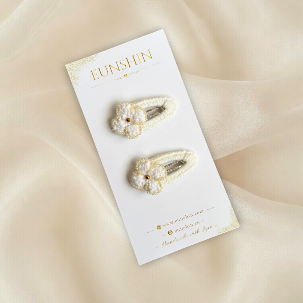Yumuşak pamuk iplik ile elde örülen çiçek detayı, merkezinde yer alan zarif boncuk işlemesi ile tamamlanmıştır. 5 cm çıtçıt toka mekanizması saçları nazikçe tutar, kaymayı önler ve gün boyu rahat kullanım sağlar.