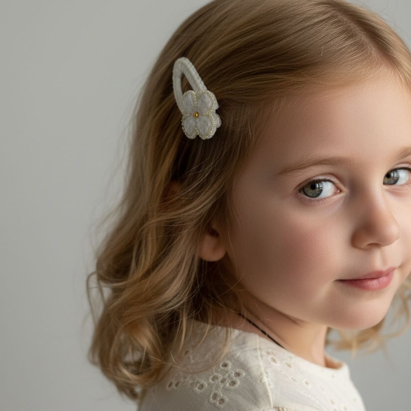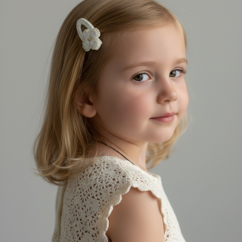 Zarif ve doğal görünümüyle öne çıkan boncuk işlemeli örgü çiçekli çıtçıt toka, bebekler ve kız çocukları için konforlu ve güvenli kullanım sunmak üzere tasarlanmıştır. Minimal çiçek formu saçlara sade bir şıklık kazandırırken el işçiliğinin sıcak dokusu her tokayı özel kılar.