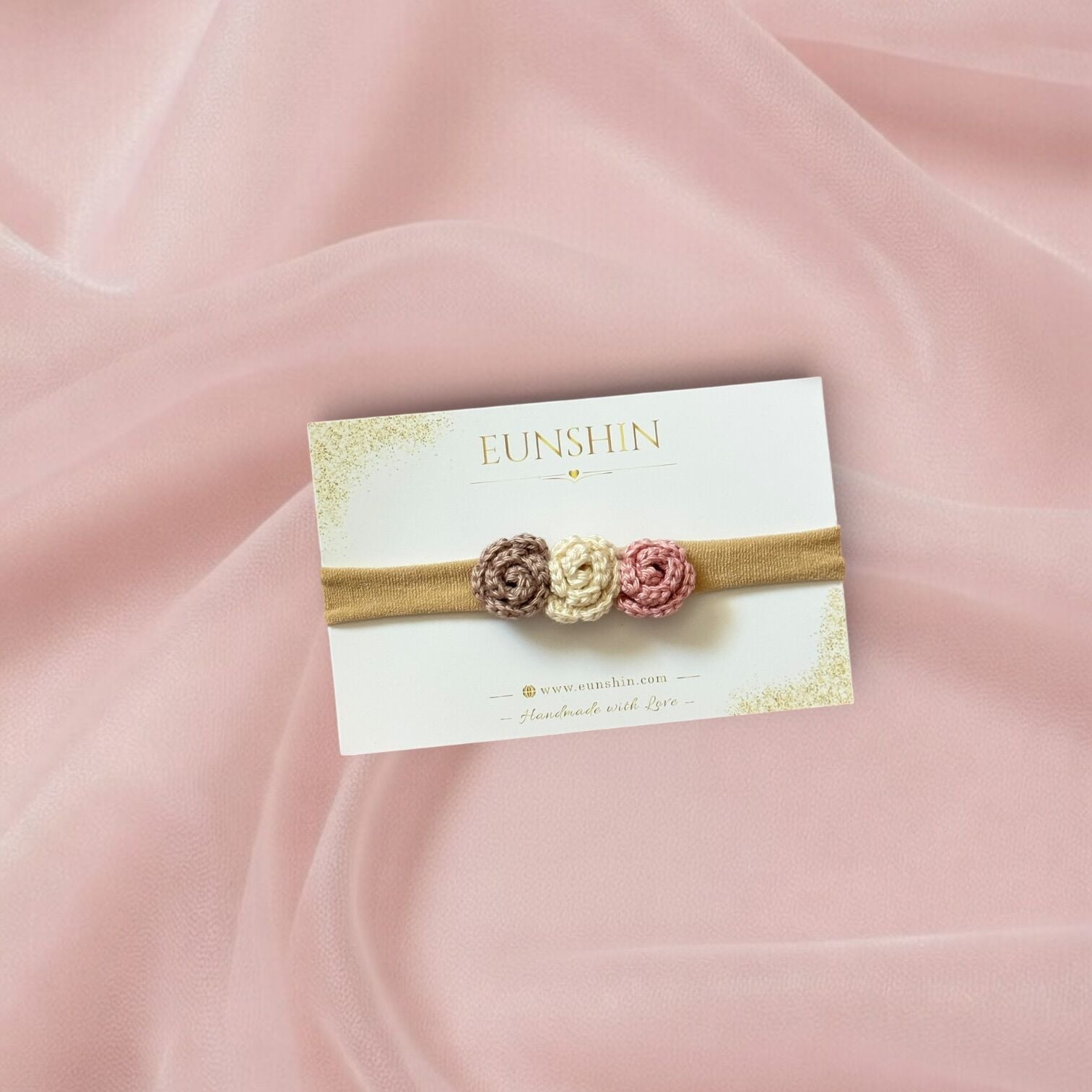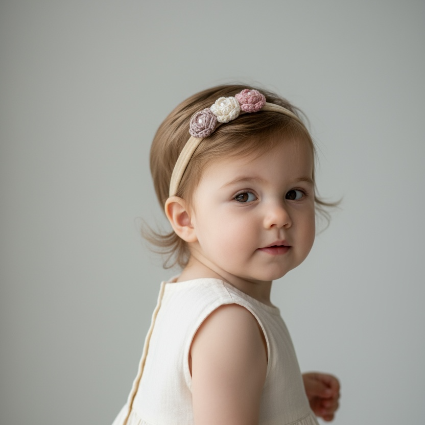 Pastel mini gül detaylarıyla tasarlanan el yapımı bebek kafa bandı, hassas bebek cildi için yumuşak ve esnek yapıya sahiptir. Yenidoğan çekimleri, özel günler ve günlük kullanım için zarif bir tamamlayıcıdır.