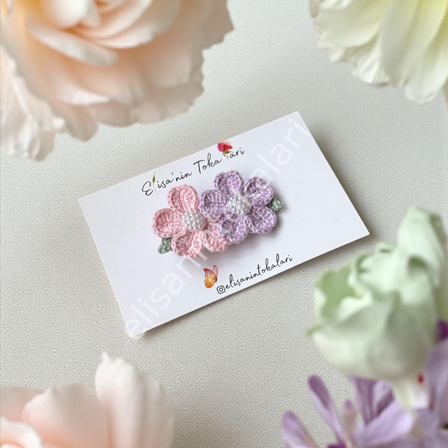 Zarif çift çiçek tasarımı ve inci dokulu merkez detayıyla hazırlanan el yapımı klips toka, romantik ve şık bir görünüm sunar. Pastel tonları sayesinde günlük kombinlere zarif bir dokunuş katar.