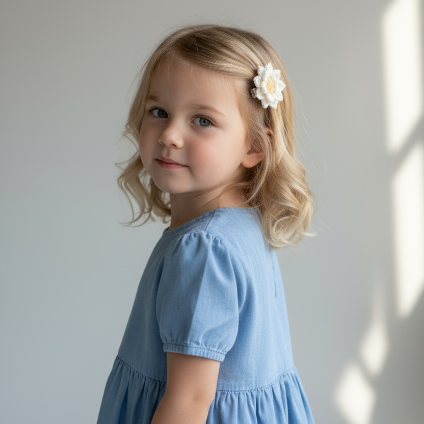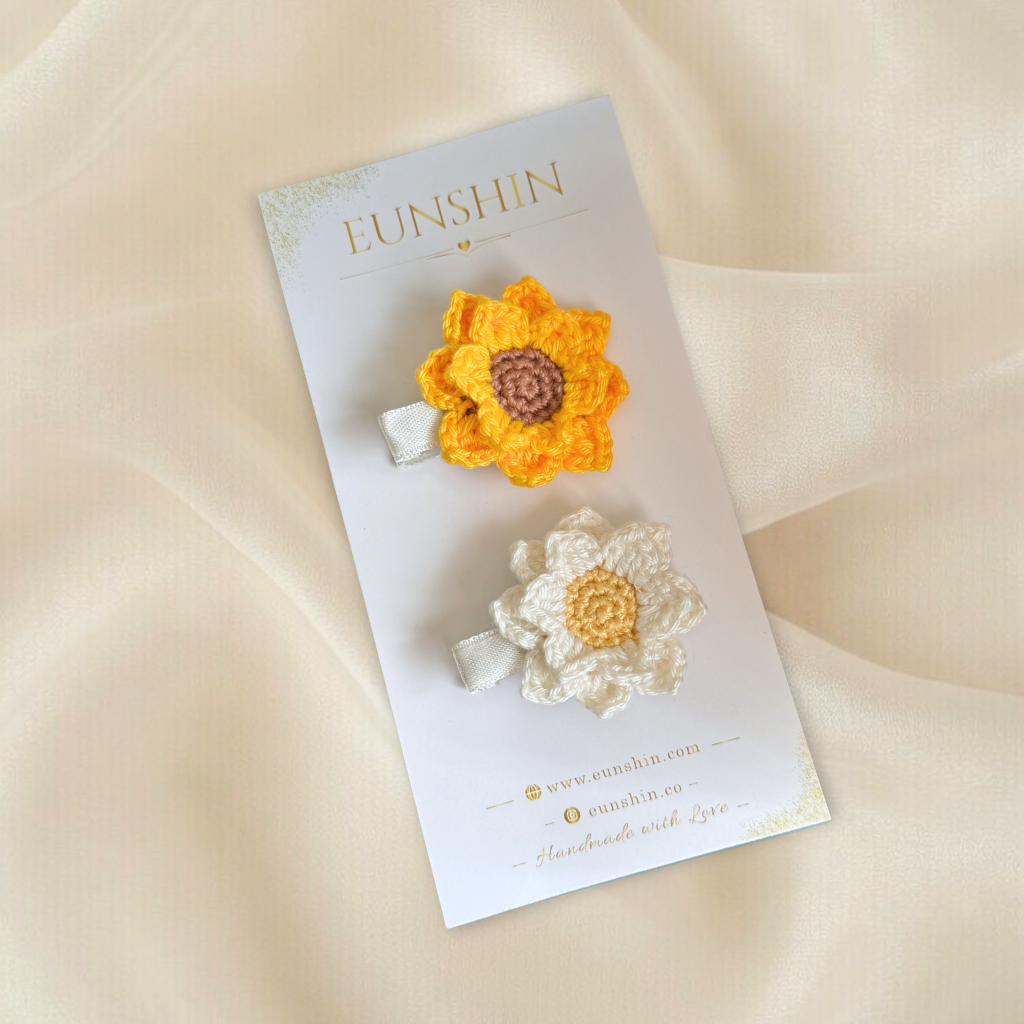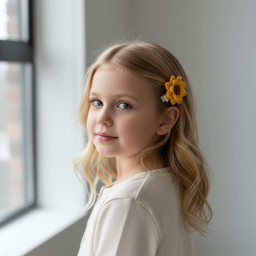 Papatya ve ayçiçek formunda tasarlanan el yapımı klips toka, çocukların stiline doğal ve neşeli bir dokunuş katar. Yumuşak örgü dokusu ve çiçek formu sayesinde zarif bir görünüm sunarken saçta konforlu kullanım sağlar.