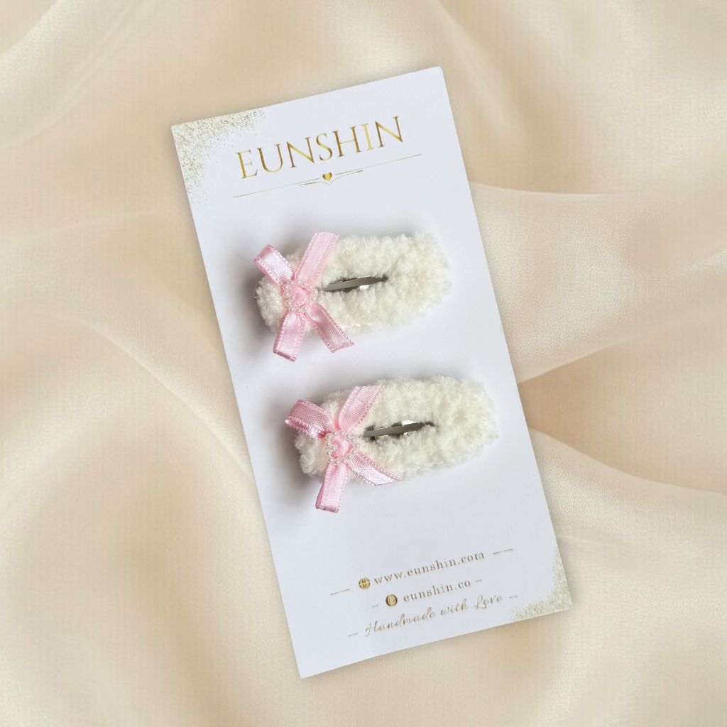 Pembe Fiyonk ve İnci Kalp Detaylı Çıtçıt Toka – 5 cm Yumuşak Örgü Bebek & Kız Çocuk Saç Tokası