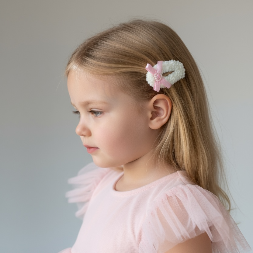 Nazik dokusu ve romantik detaylarıyla öne çıkan pembe fiyonk ve inci kalp detaylı örgü çıtçıt toka, bebek ve çocuk saçları için konforlu ve zarif bir kullanım sunmak üzere tasarlanmıştır. Yumuşak örgü yüzeyi saç tellerine zarar vermezken pembe fiyonk detayı tasarıma sevimli bir görünüm kazandırır. Ortadaki inci kalp süsleme ise tokaya duygusal ve zarif bir dokunuş katar.