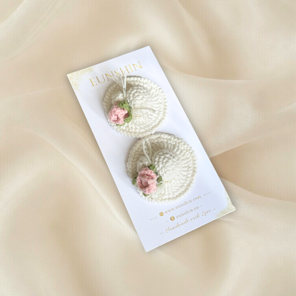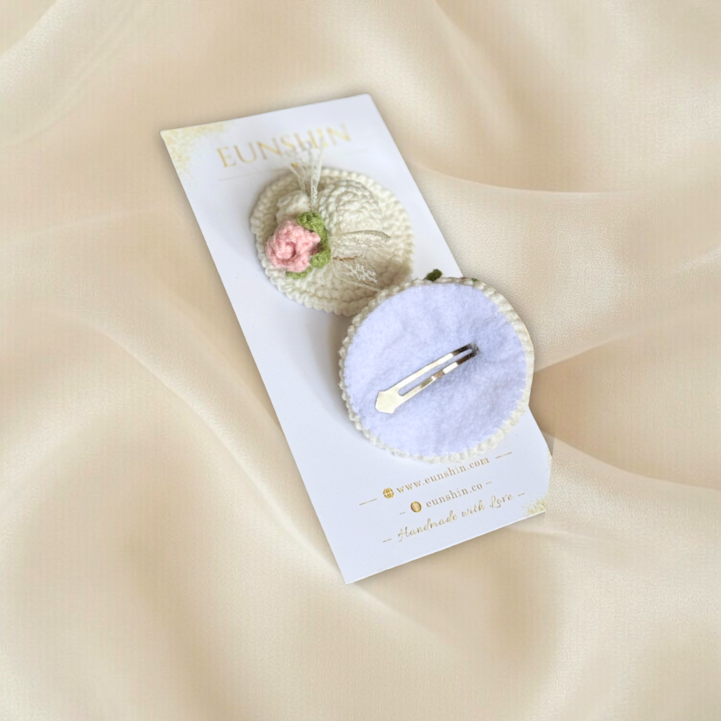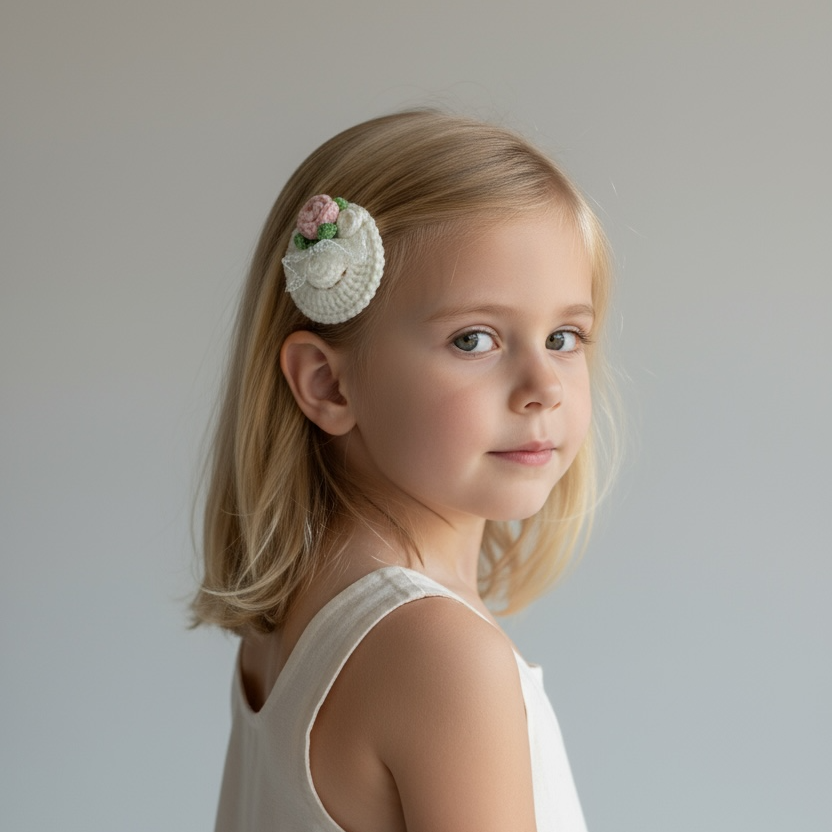 Vintage stilin zarafetini yansıtan örgü şapka formundaki çıt çıt toka, romantik ve nostaljik görünümüyle saçlara benzersiz bir şıklık kazandırır. El işçiliği ile hazırlanan ekru örgü zemin üzerine yerleştirilen minik gül detayı tasarıma zarif ve butik bir karakter kazandırır.