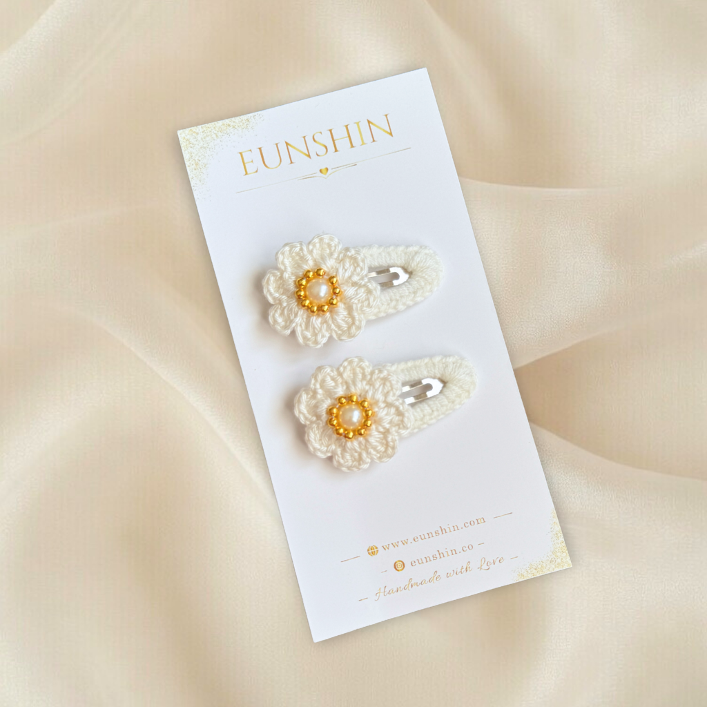İnci Detaylı Örgü Papatya Çıtçıt Toka 5 cm – El Yapımı Çocuk Saç Tokası