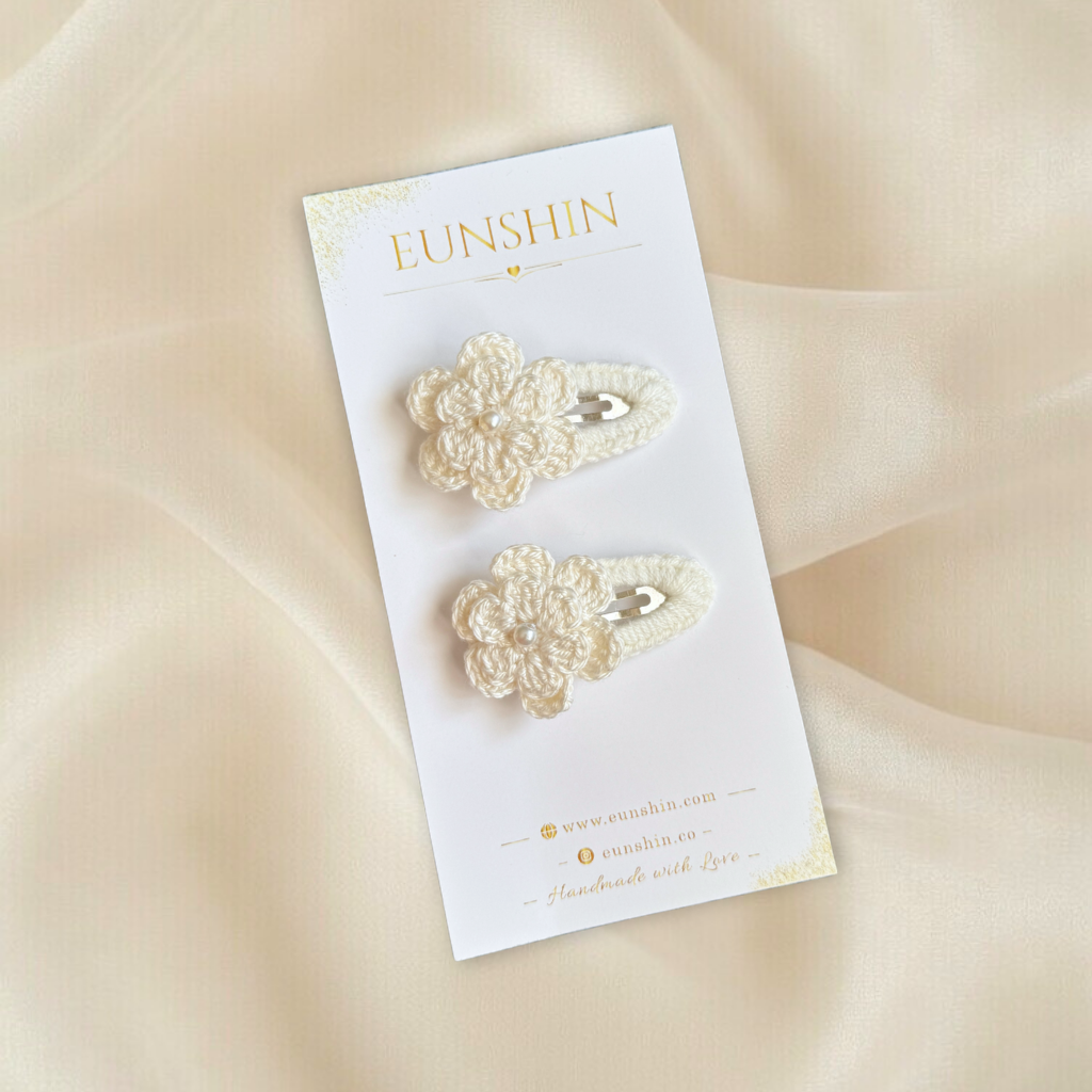 İnci Detaylı Örgü Papatya Çıtçıt Toka 5 cm – El Yapımı Çocuk Tokası