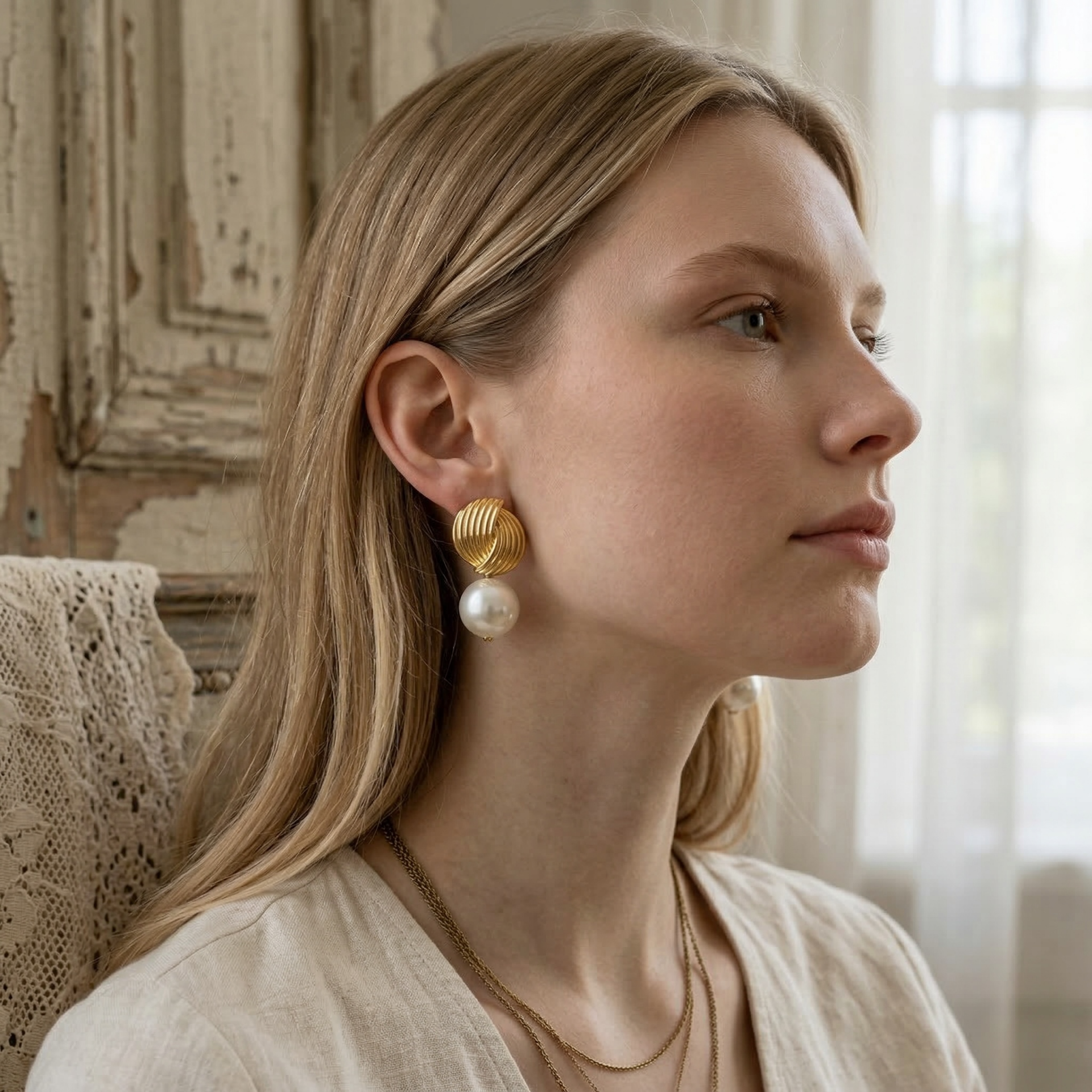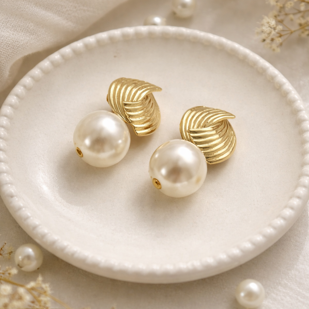 Pirinç üzeri gold kaplama formu ve inci detayıyla tasarlanan bu vintage küpe, sade ama dikkat çekici bir görünüm sunar. Vintage dokunuşu sayesinde hem günlük kullanımda hem özel günlerde stilinizi tamamlar.