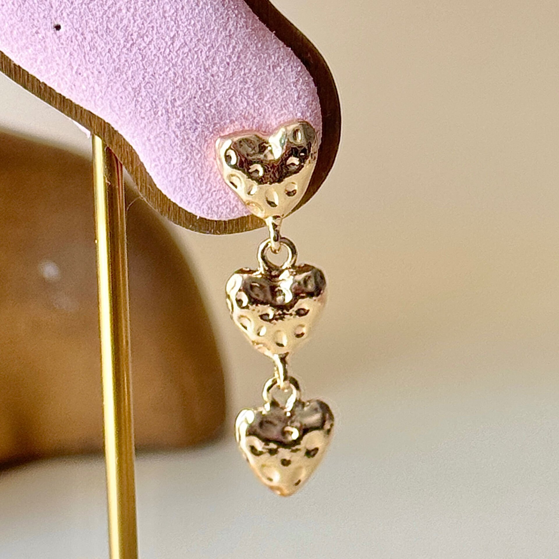 Zarif ve feminen tasarımıyla öne çıkan kalp detaylı sallantılı küpe, romantik stilin en şık halini sunar. Pirinç üzeri gold kaplama yapısı sayesinde parlak ve premium bir görünüm elde edilirken, üçlü kalp formu hareketli yapısıyla ışığı yansıtarak dikkat çekici bir etki oluşturur. Günlük kombinlerde zarif bir dokunuş, özel günlerde ise tamamlayıcı bir şıklık sağlar. Hafif yapısı sayesinde gün boyu konforlu kullanım sunar. Eunshin koleksiyonunun minimal ama etkili parçalarından biridir.