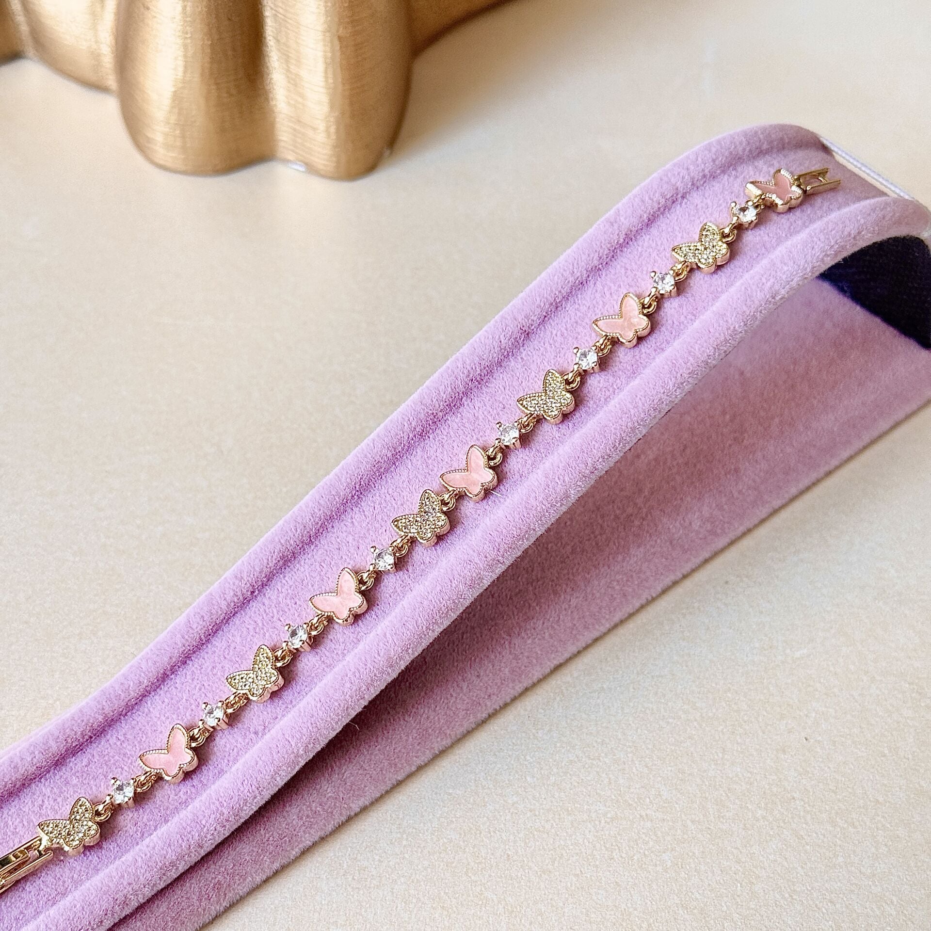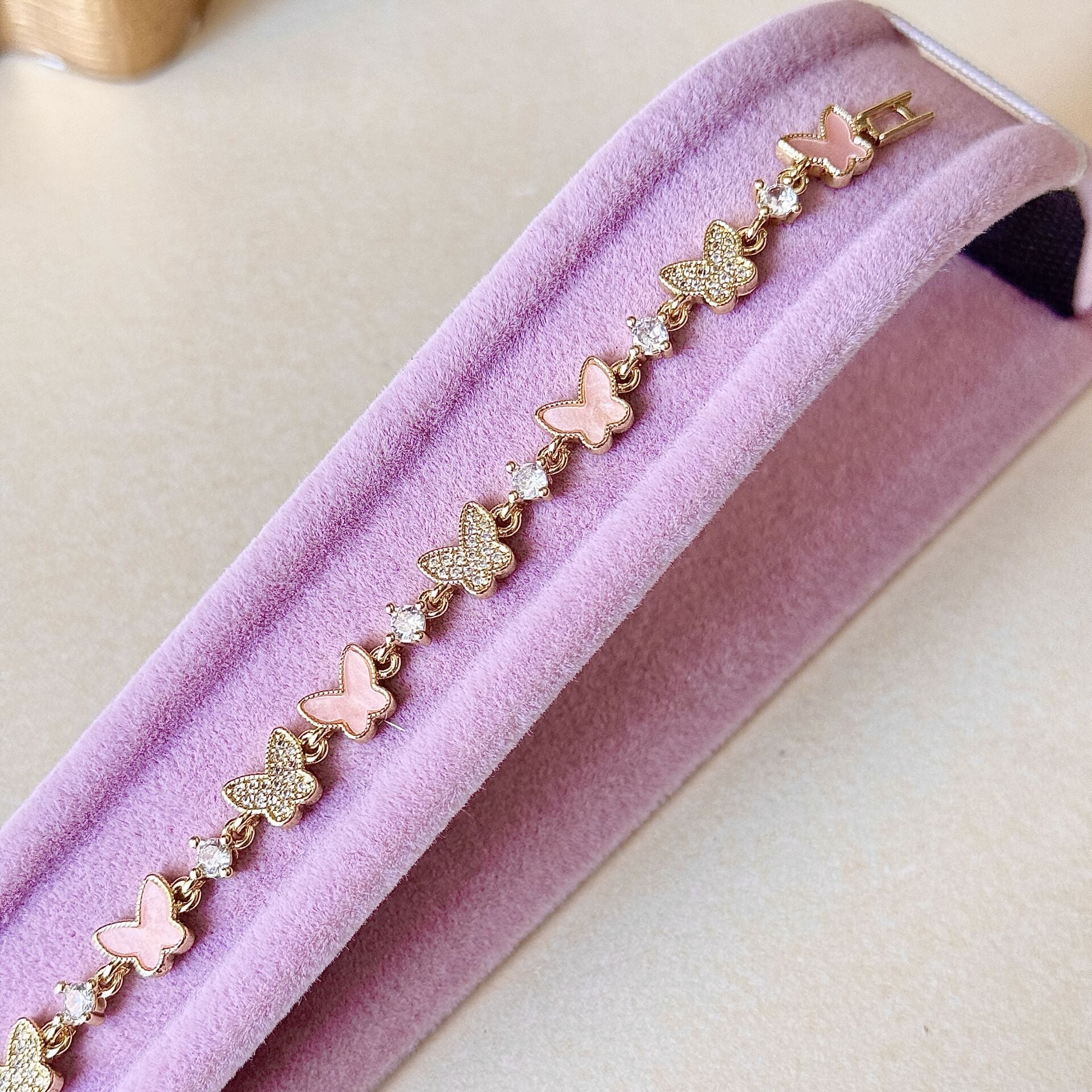 Gold kelebek detaylı bileklik, taşlı ve mine detaylı kelebek figürleriyle bilekte canlı ve dikkat çekici bir görünüm sunar Renkli ve ışıltılı yapısı sayesinde klasik modellerden ayrılır
