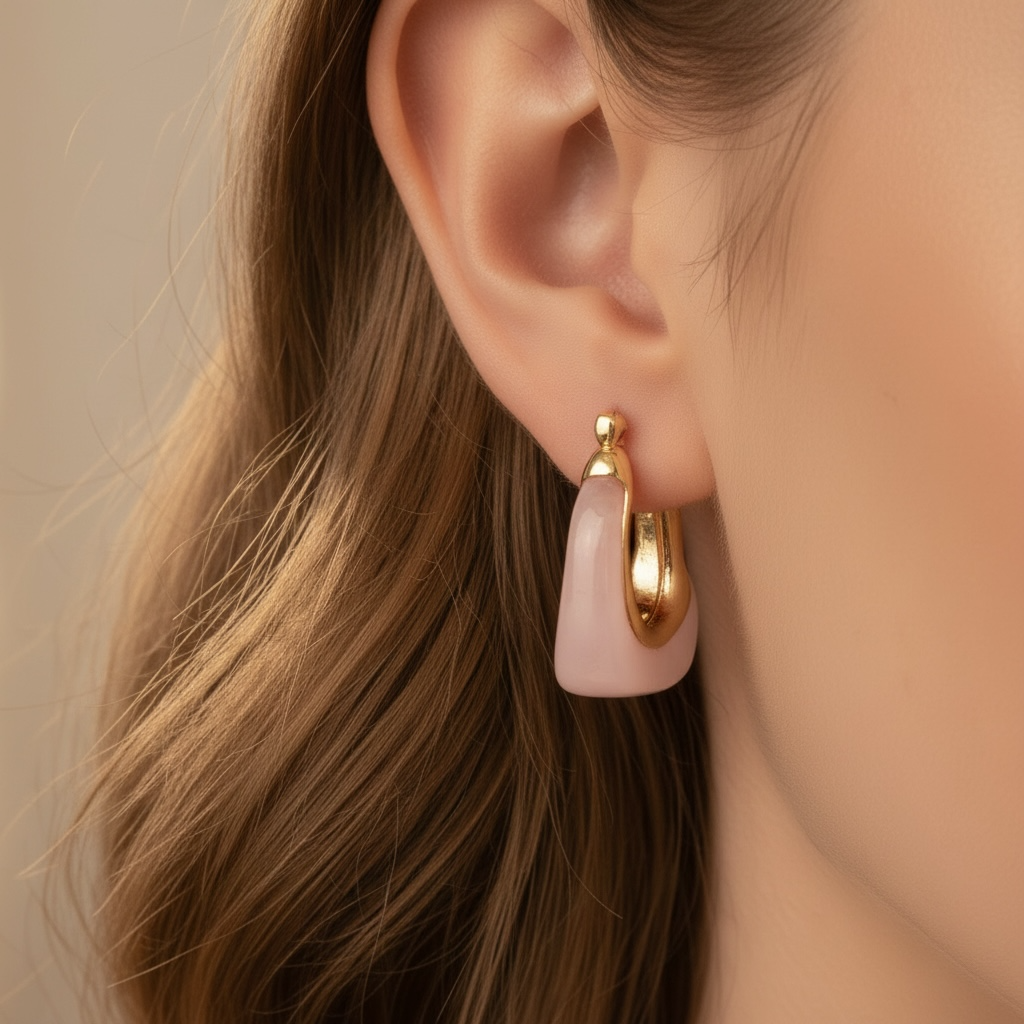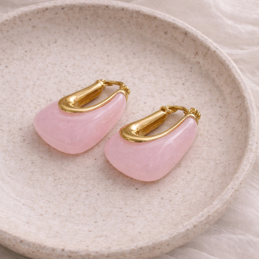 Modern çizgilerin zarafetle buluştuğu bu özel tasarım küpeler, pembe mine detayları ve parlak gold formuyla dikkat çeker. Hafif yapısı sayesinde gün boyu konfor sağlar.