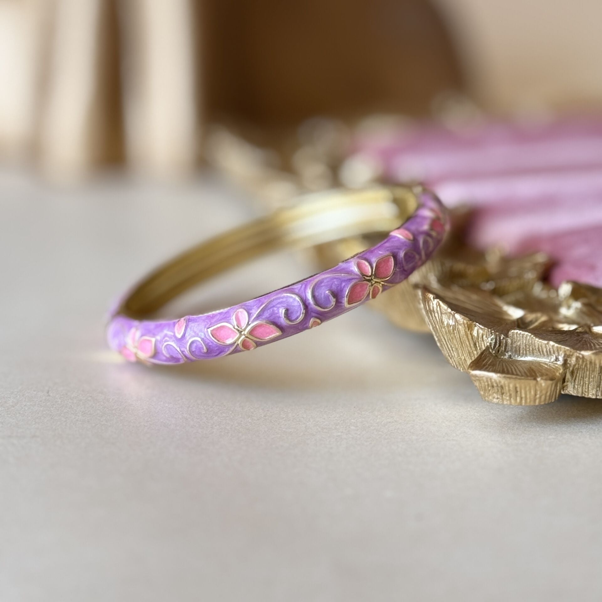 Gold kaplama kelepçe bileklik, mor tonlu mine yüzeyi ve çiçek desenli detaylarıyla enerjik ve zarif bir tasarım sunar. Renkli mine işçiliği ürüne canlılık katarken, ince kelepçe formu bilekte dengeli ve şık bir duruş sağlar.