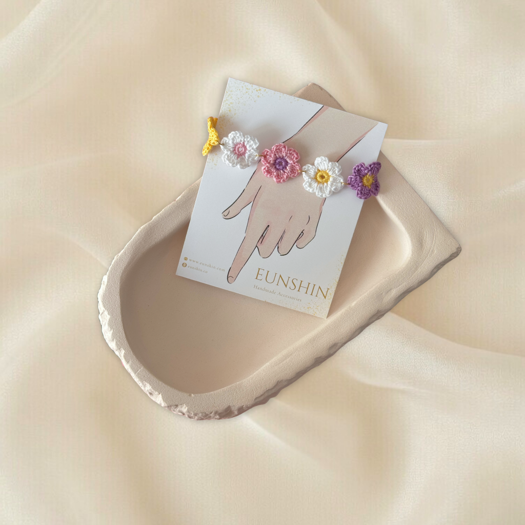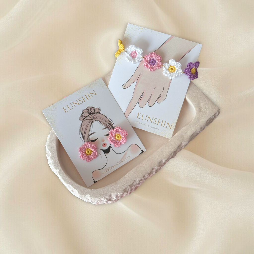 Örgü Papatya Bileklik ve Küpe Seti – El Yapımı Çiçek Takı Seti Pirinç Uzatma Aparatlı