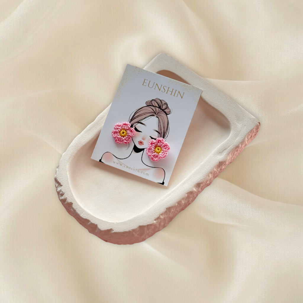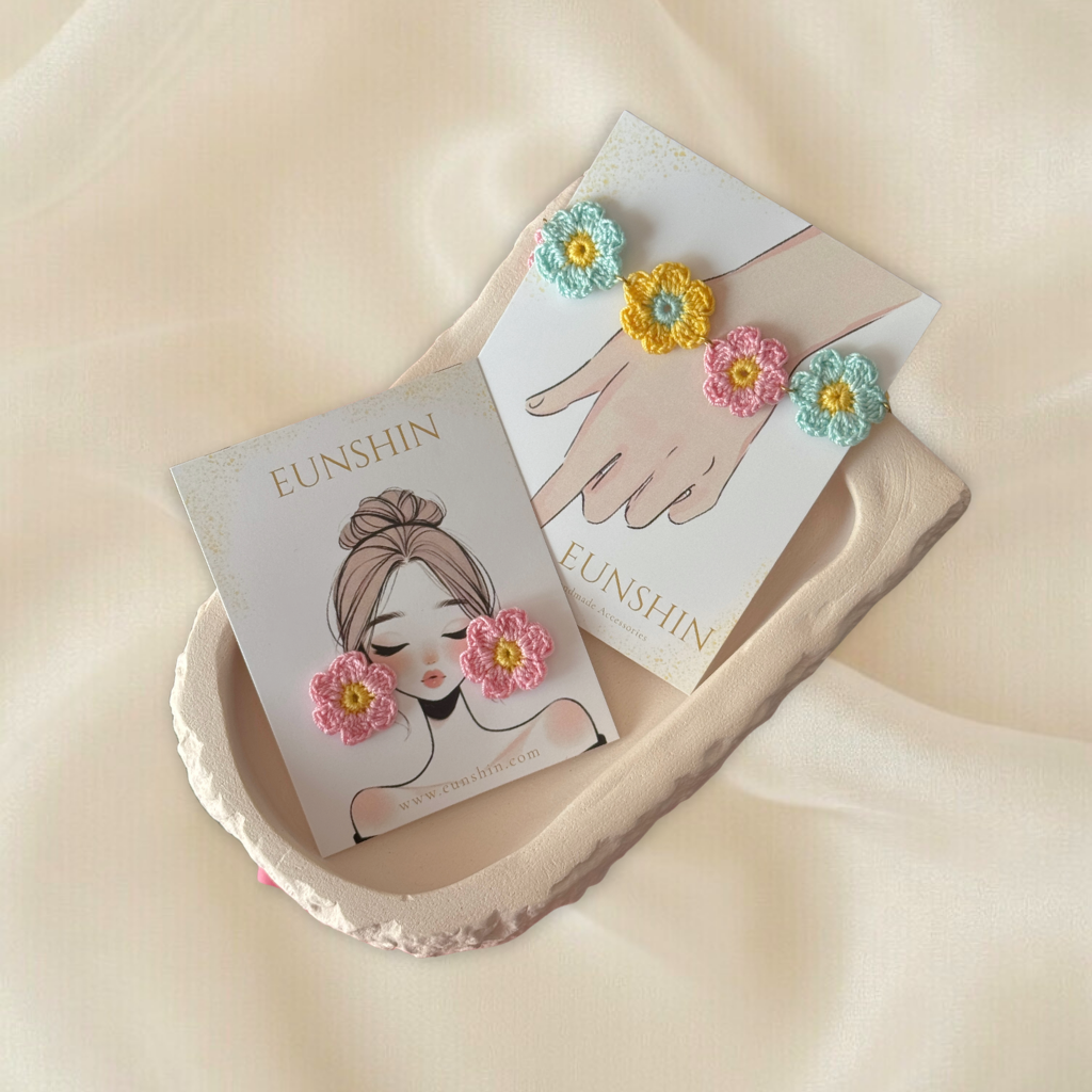 Örgü Papatya Bileklik ve Küpe Seti – El Yapımı Çiçek Takı Seti Pirinç Uzatma Aparatlı