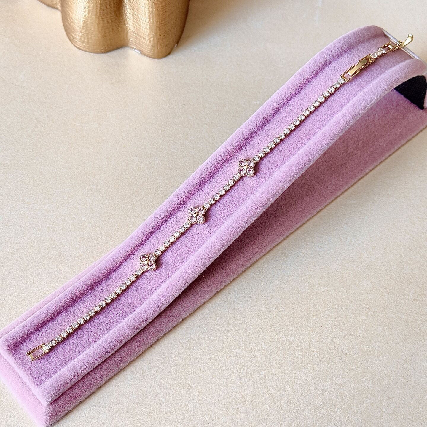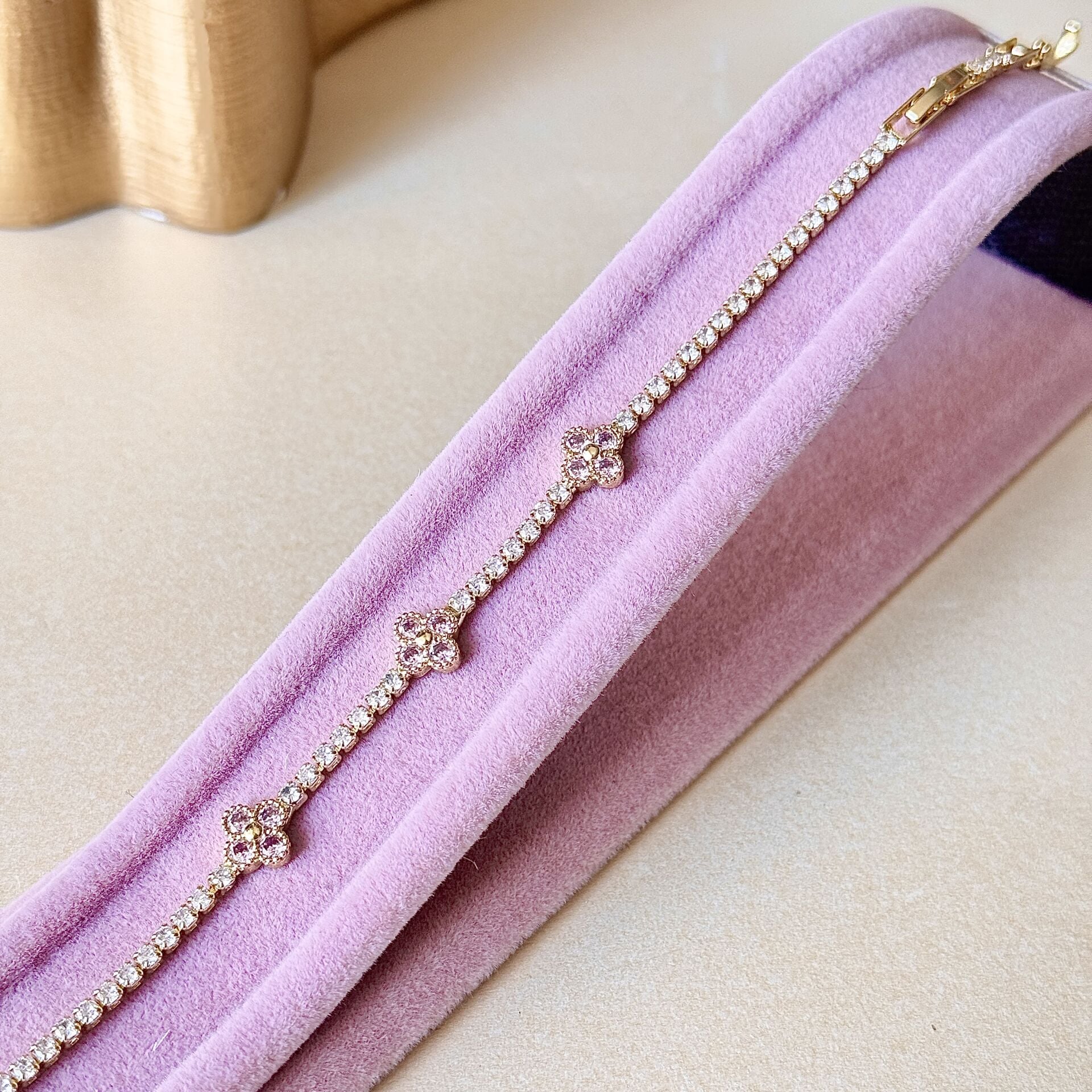 Pembe taşlı yonca gold bileklik, ince zirkon dizilimi ve aralara yerleştirilen yonca form detayları ile feminen ve zarif bir görünüm sunar Yonca figürün içindeki pembe taş dokunuşu ürüne farklı ve özel bir karakter kazandırır