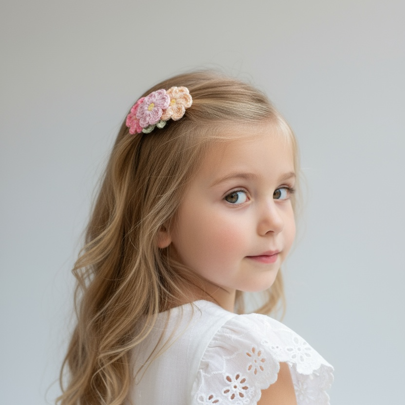 Pastel tonlarda üç çiçek detayıyla tasarlanan el yapımı örgü çıtçıt toka, romantik ve zarif görünümüyle saç stiline yumuşak bir dokunuş katar. Hafif yapısı sayesinde gün boyu konfor sağlar ve hem çocuklar hem yetişkinler için şık bir aksesuardır.