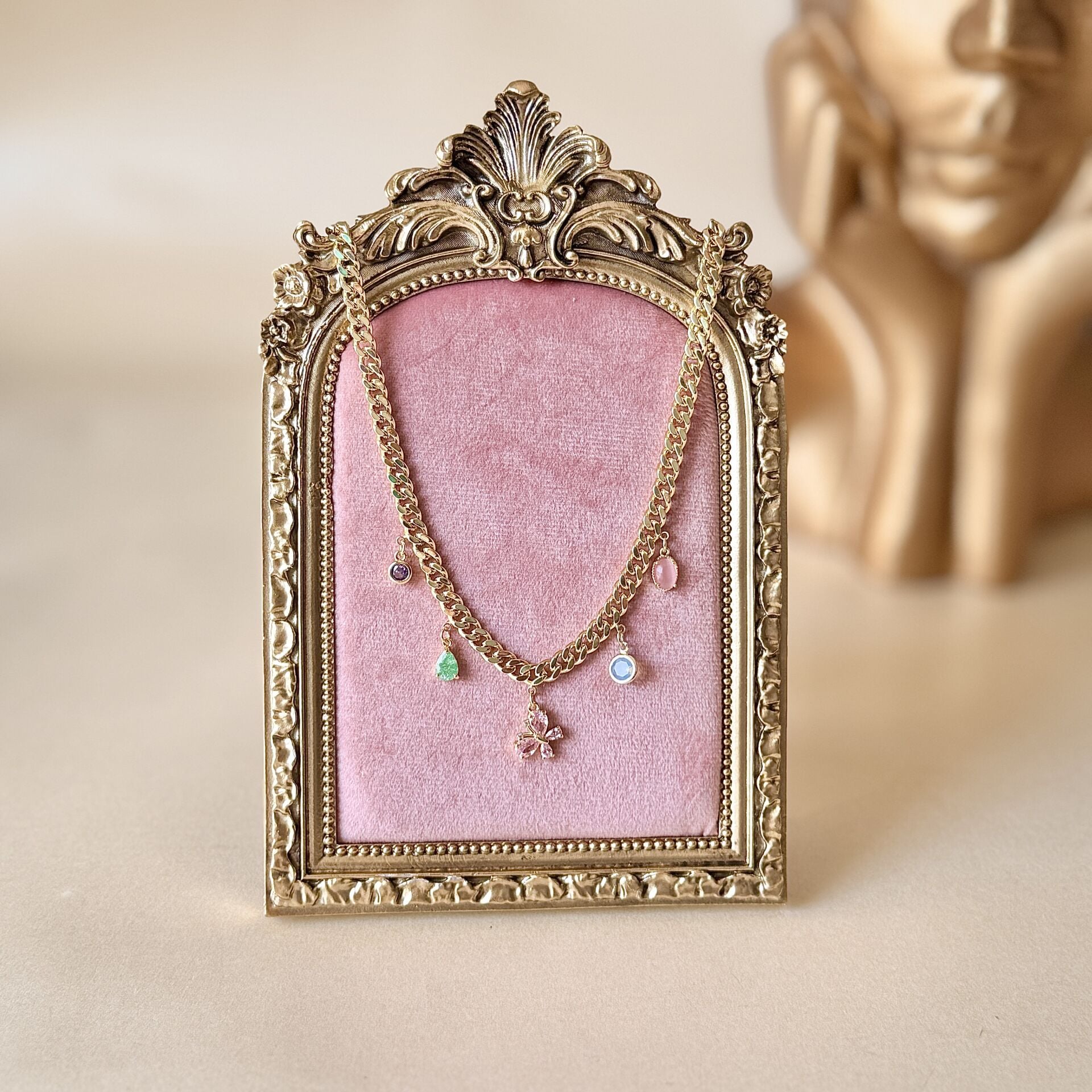 Renkli taş detaylı zincir kolye, kalın zincir formu ve üzerine yerleştirilmiş farklı renklerde taş figürleri ile dikkat çekici ve dinamik bir stil sunar