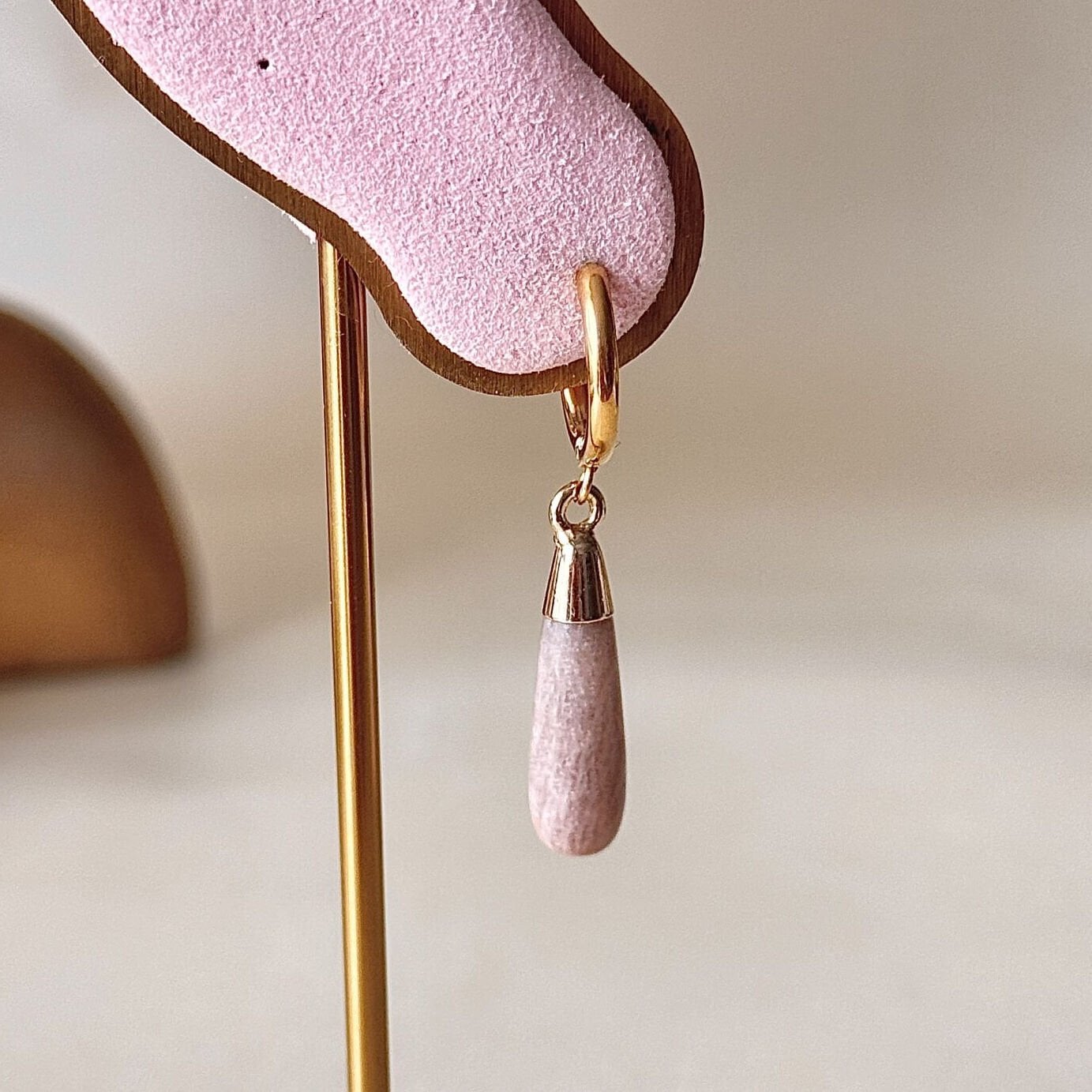 Damla formda kullanılan rodonit taş, yumuşak pembe tonlarıyla feminen ve dengeli bir görünüm sunar. Doğal taş yapısı sayesinde her parça kendine özgü doku ve renge sahiptir.