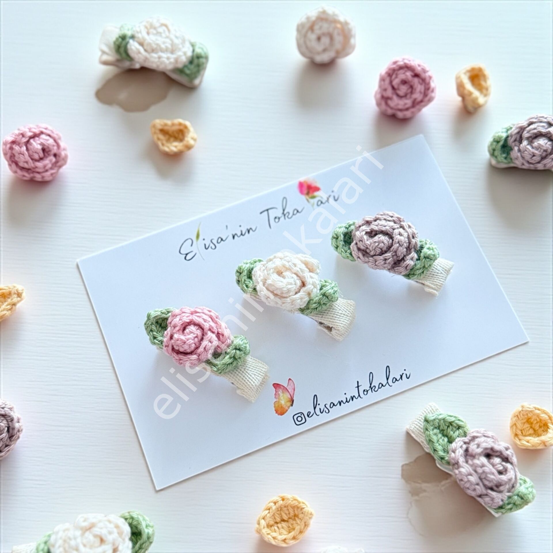 Zarif ve romantik detaylarıyla öne çıkan el yapımı örgü gül tokalar, günlük kullanım ve özel gün kombinleri için şık bir tamamlayıcıdır.