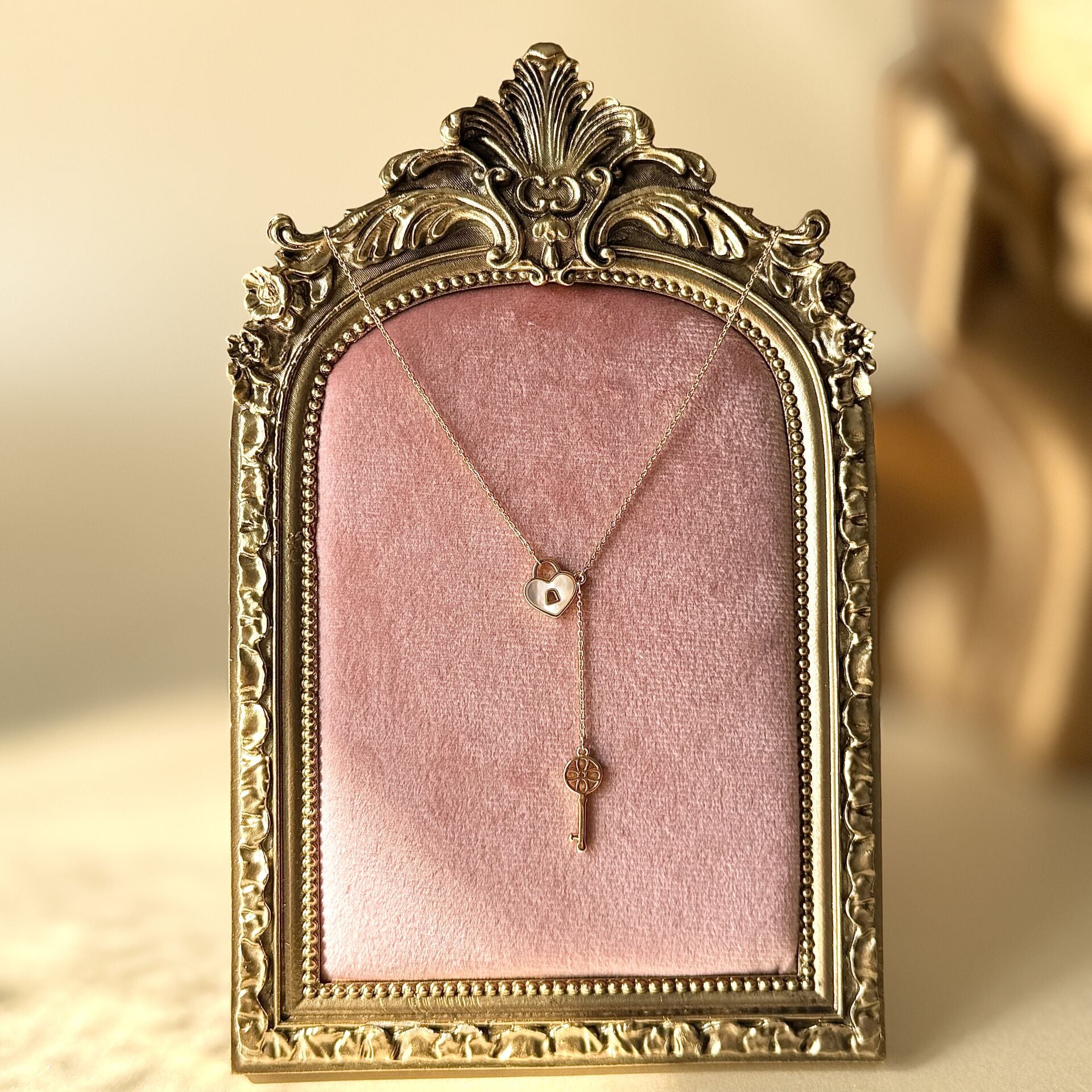 Sedef yüzeyli kalp kilit detayı ve zarif anahtar figürü ile tasarlanan gold kaplama Y kolye, anlamlı ve dikkat çekici bir şıklık sunar. Doğal sedef dokusu ışığı yumuşak yansıtarak ürüne sofistike bir parlaklık kazandırır.