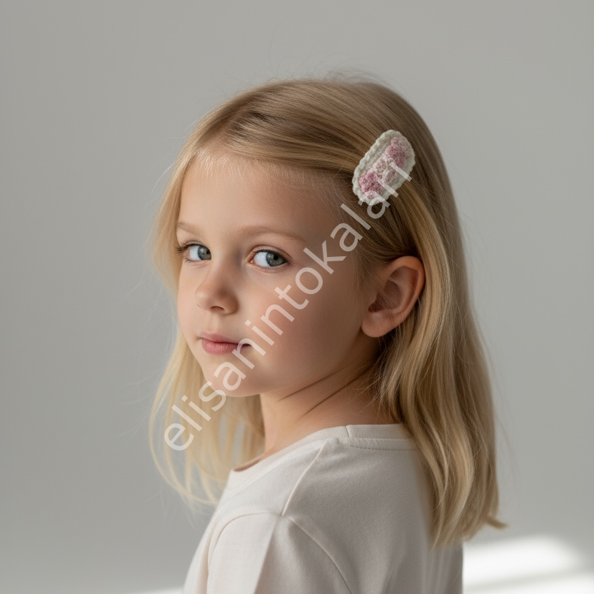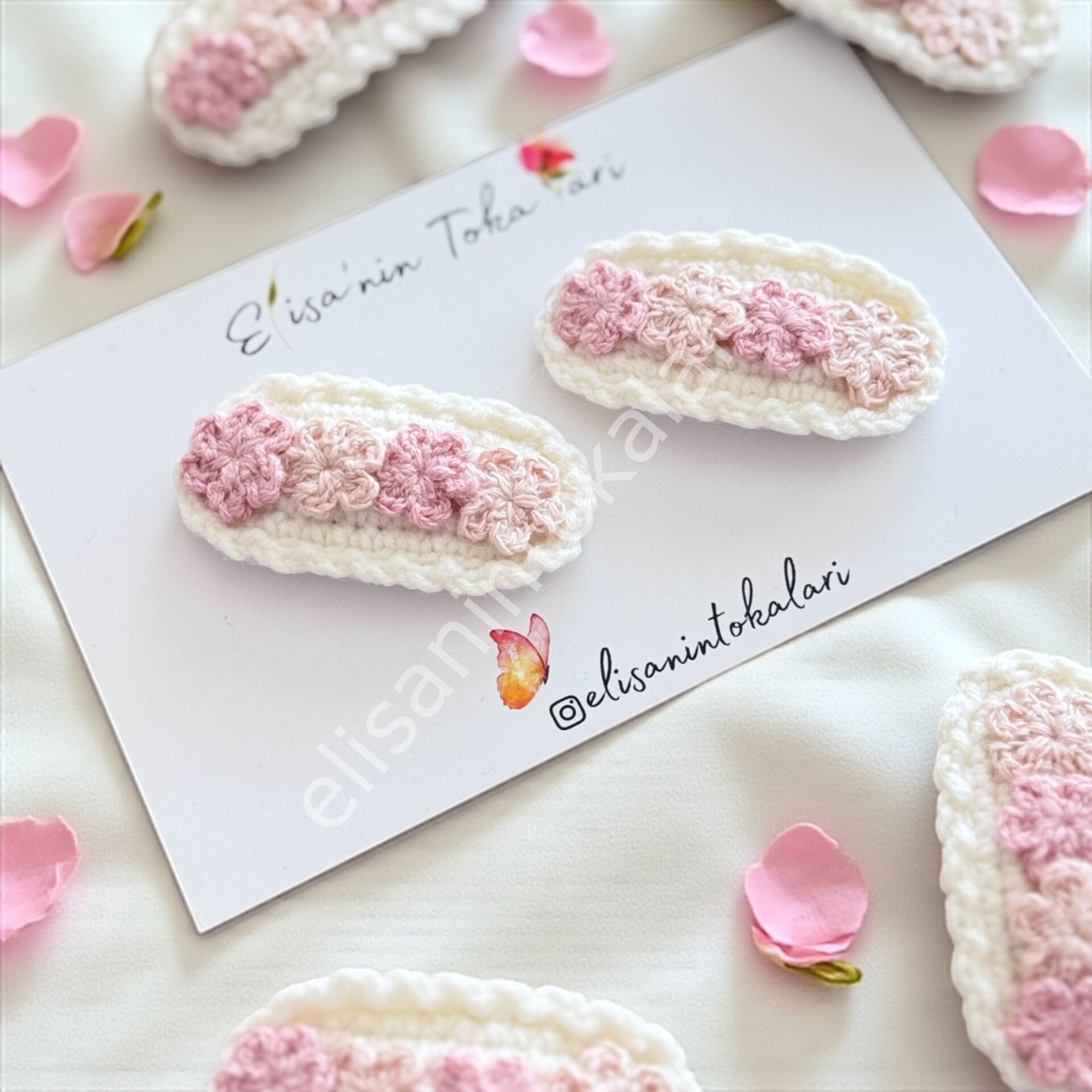 Sevimli papatya objeleri ile süslenen bu el yapımı örgü çıtçıt toka, saçlarda doğal ve romantik bir görünüm oluşturur. Günlük kullanım için hafif ve rahattır; özel günlerde ise şık bir tamamlayıcıdır.